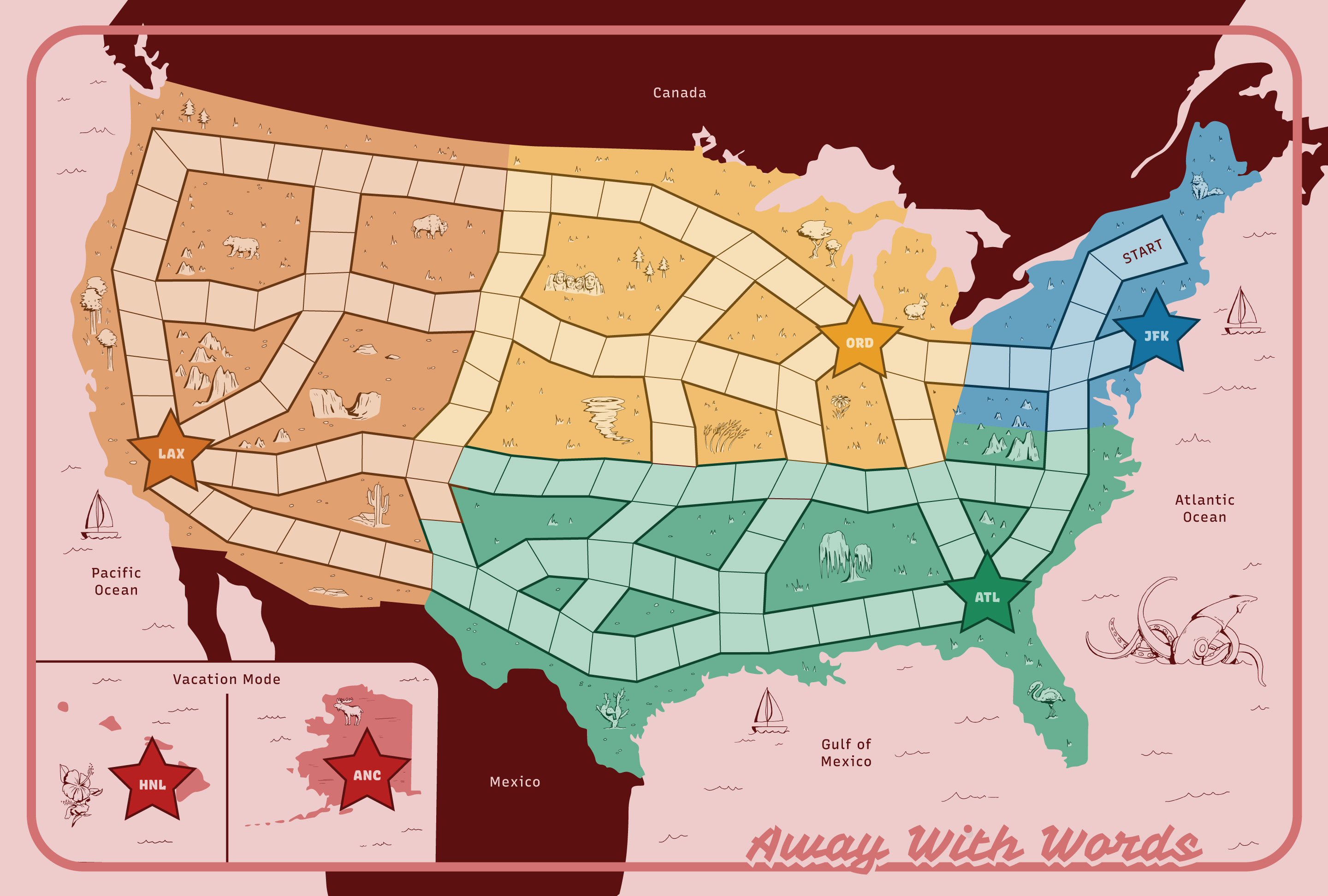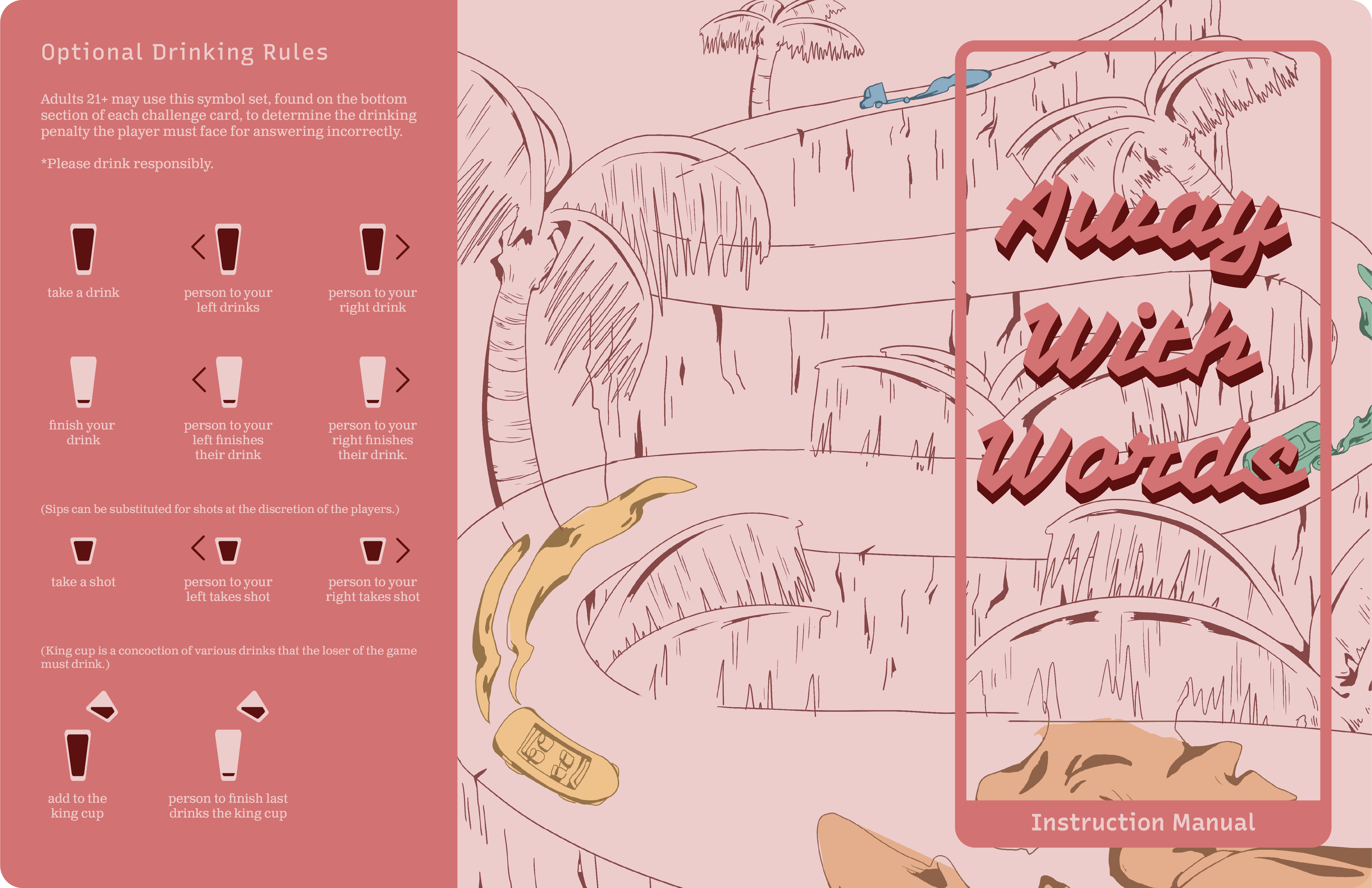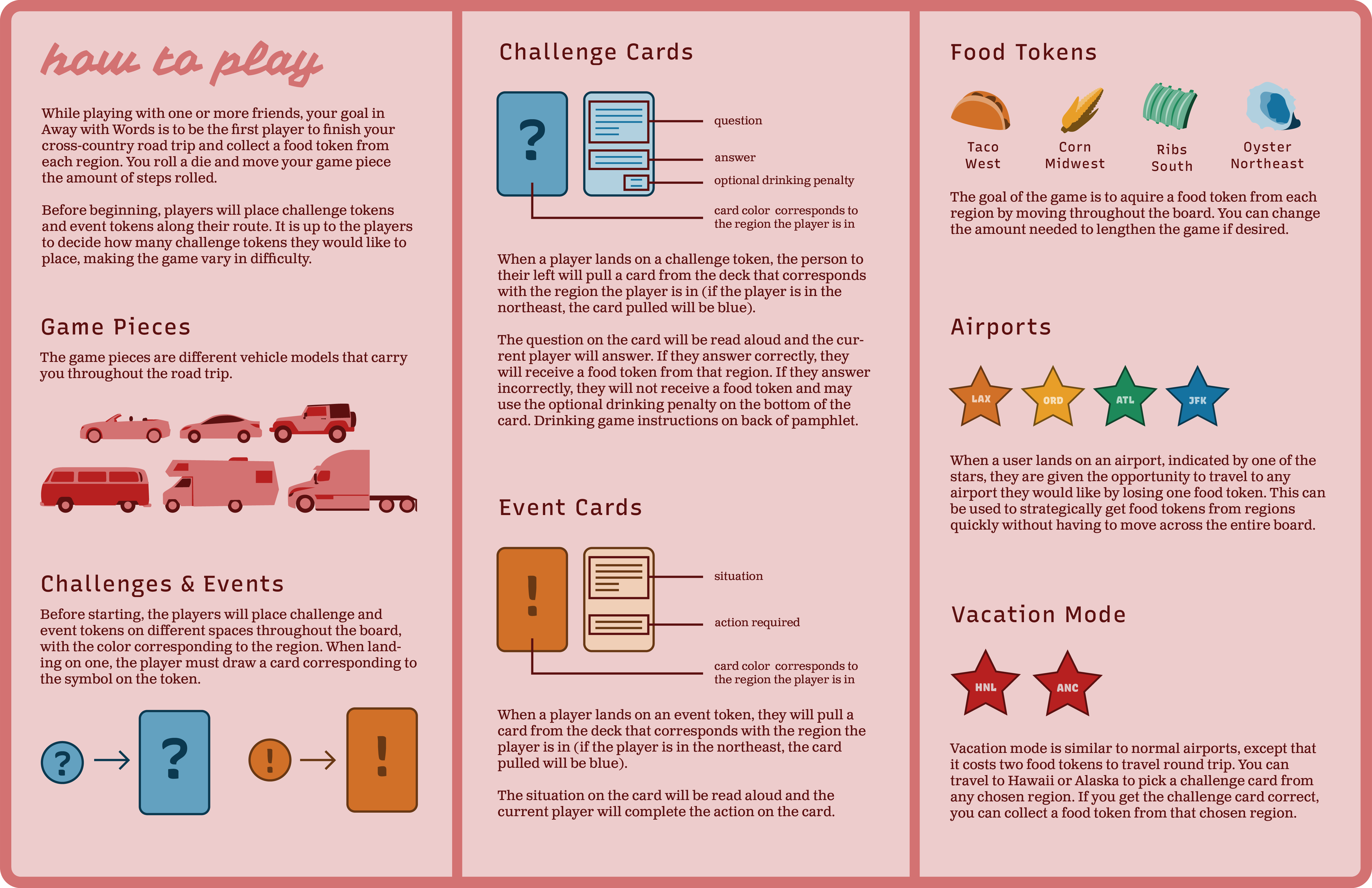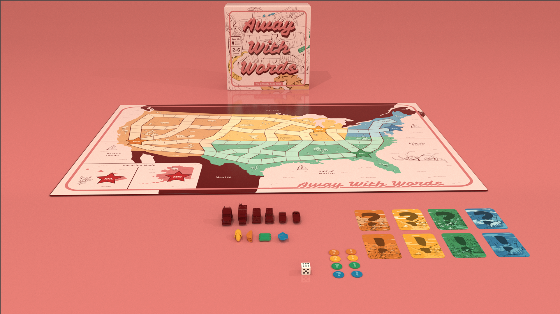 Away With Words is an a(n optional) drinking boardgame concept where the players learn about regional United States dialects and phrases while traveling across the country map. Players can collect tokens and take penalties from challenge cards. The game is to be played with at least two people. To further engage players, questions must be read aloud to hear the corny, possibly inebriation-inducing penalties.