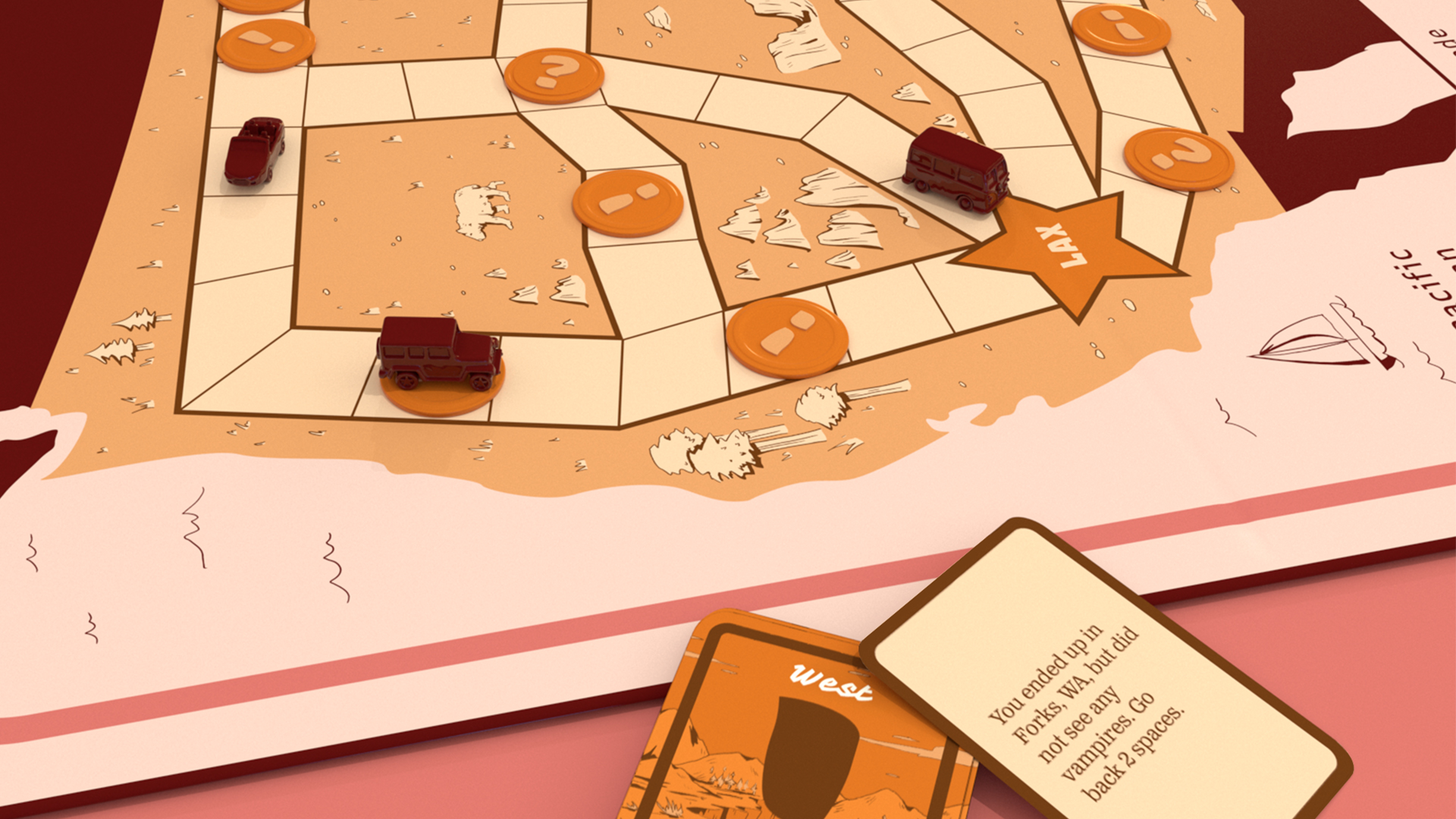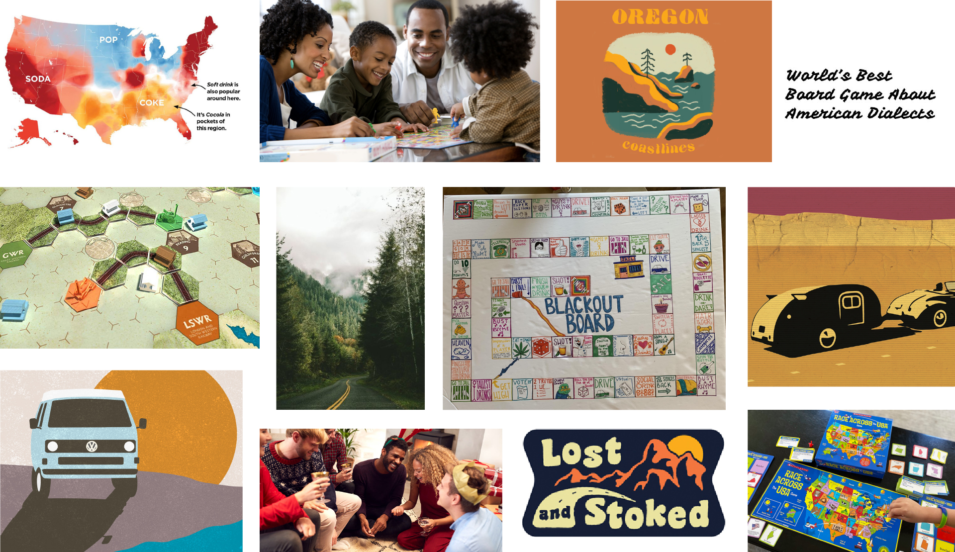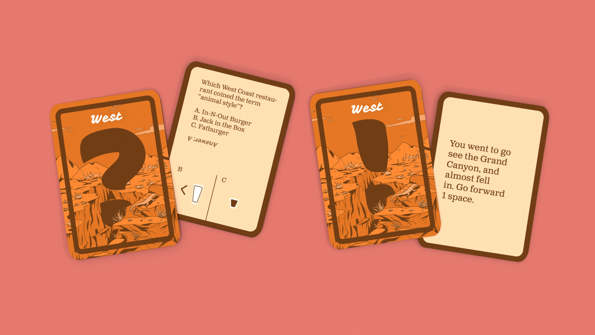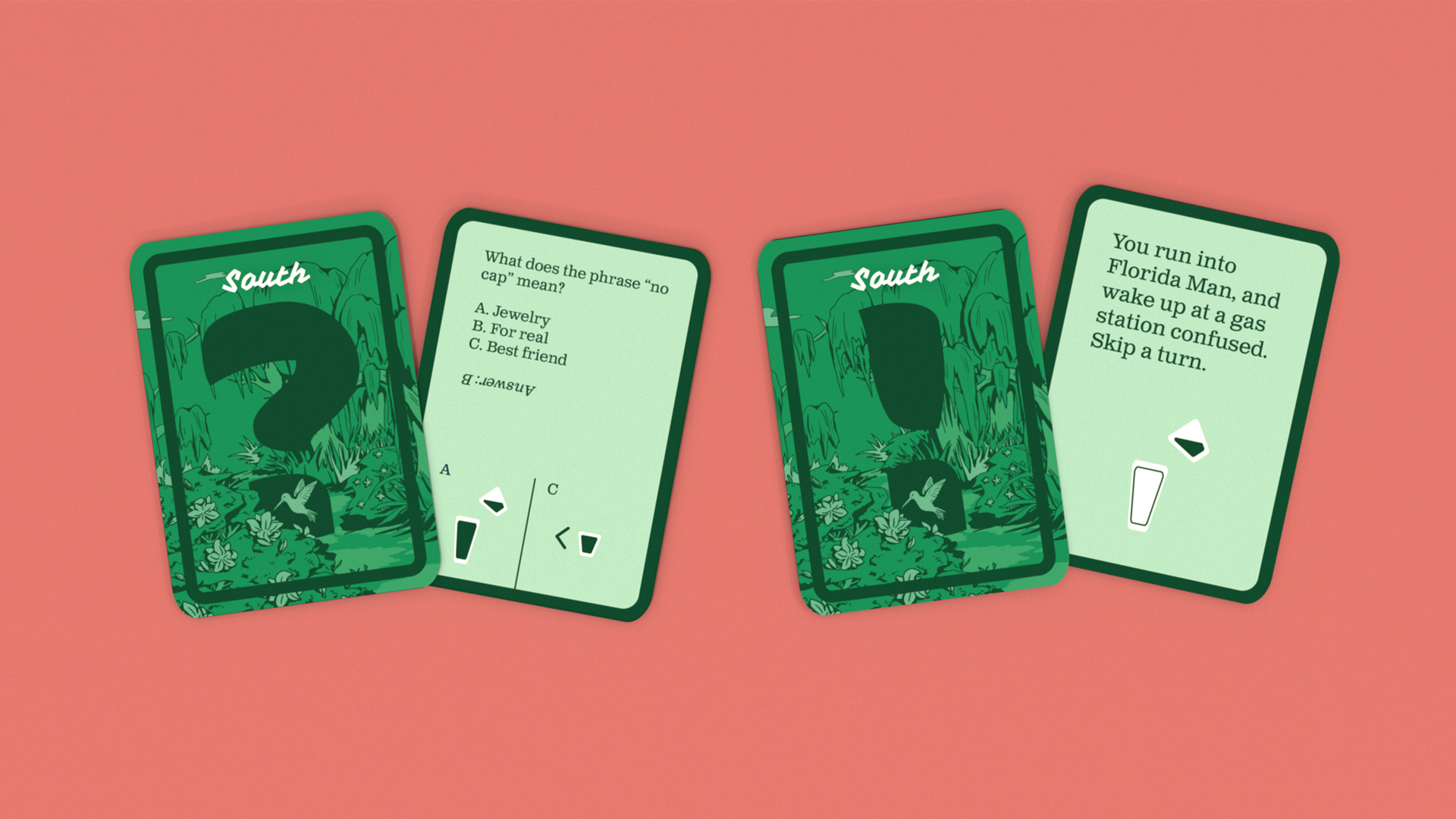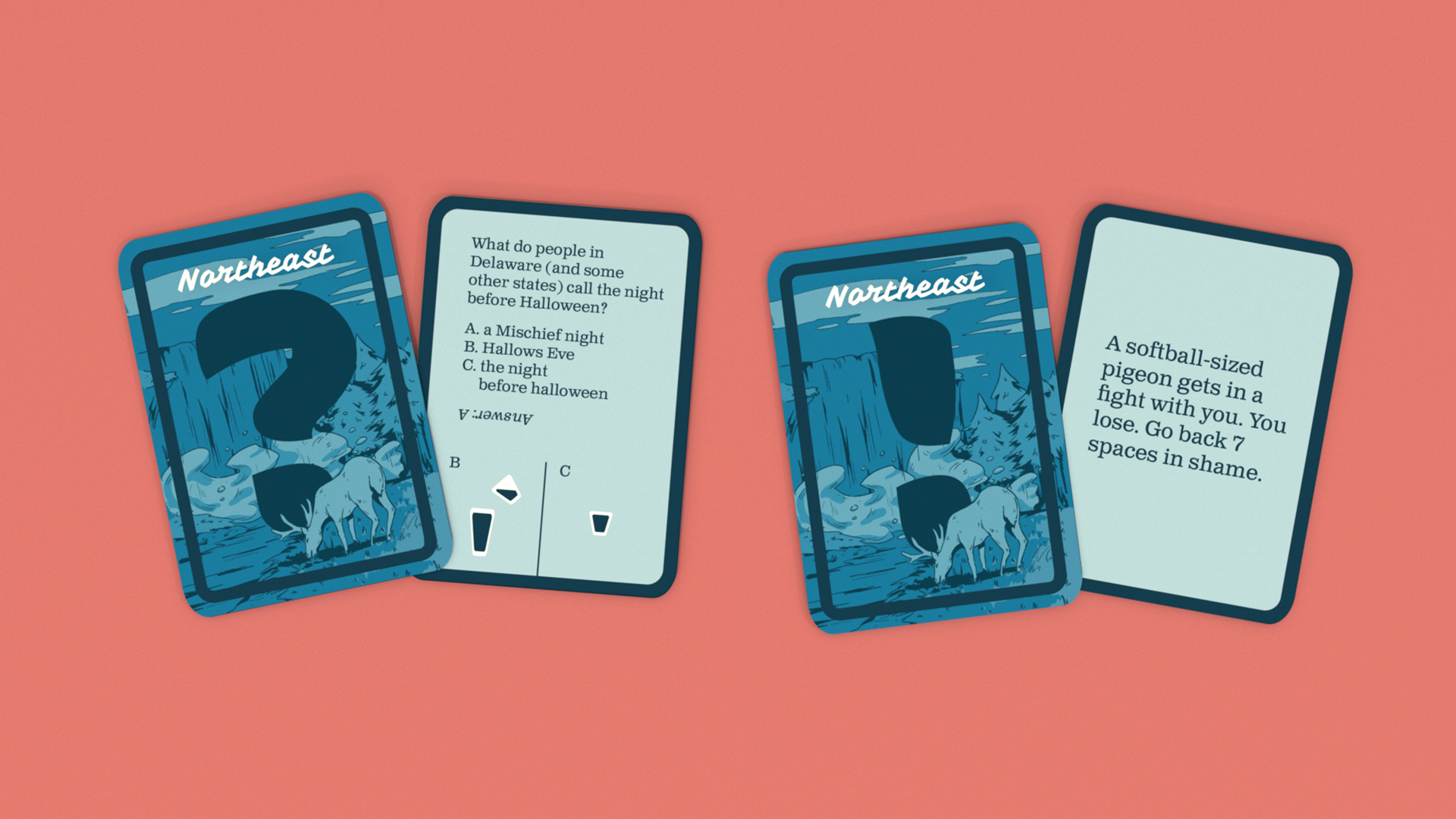 Away With Words is an a(n optional) drinking boardgame concept where the players learn about regional United States dialects and phrases while traveling across the country map. Players can collect tokens and take penalties from challenge cards. The game is to be played with at least two people. To further engage players, questions must be read aloud to hear the corny, possibly inebriation-inducing penalties.