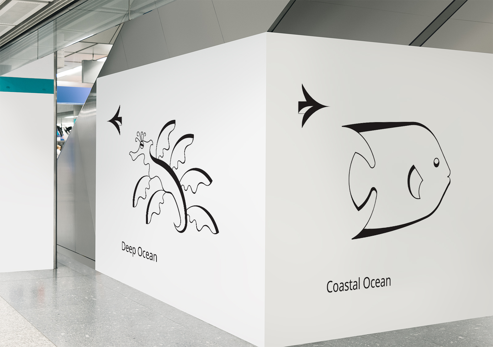 After exploration from a myriad of style language sketches, I chose to use a scalable line weight that thickens to imply the fishes’ forms and tapers at the other end. Once the symbols were finalized, I applied them into mockups showcasing how they can be used as navigation signage, app iconography, and branding on exhibition transportation trucks, demonstrating the scalability and usage for this symbol set.