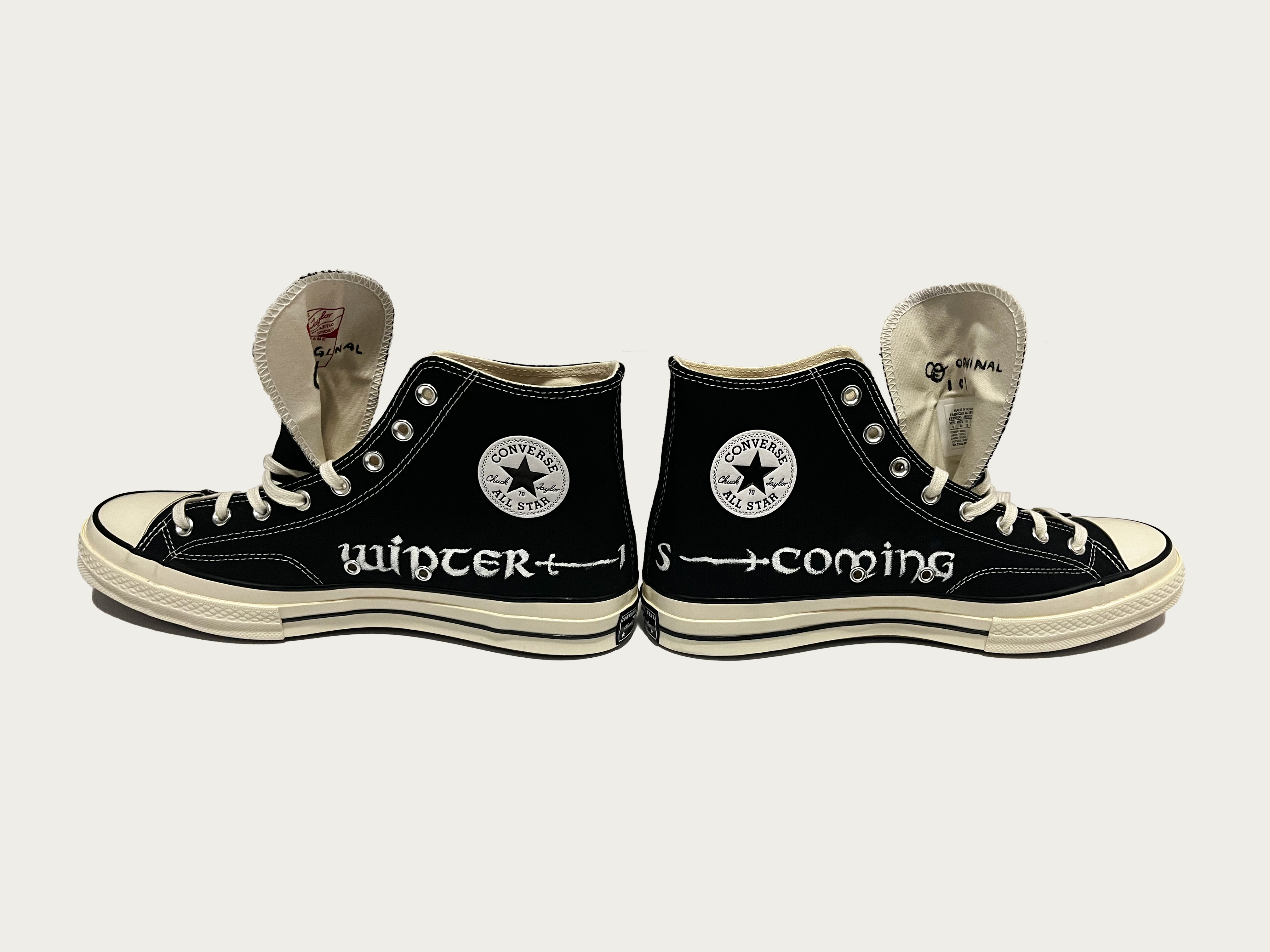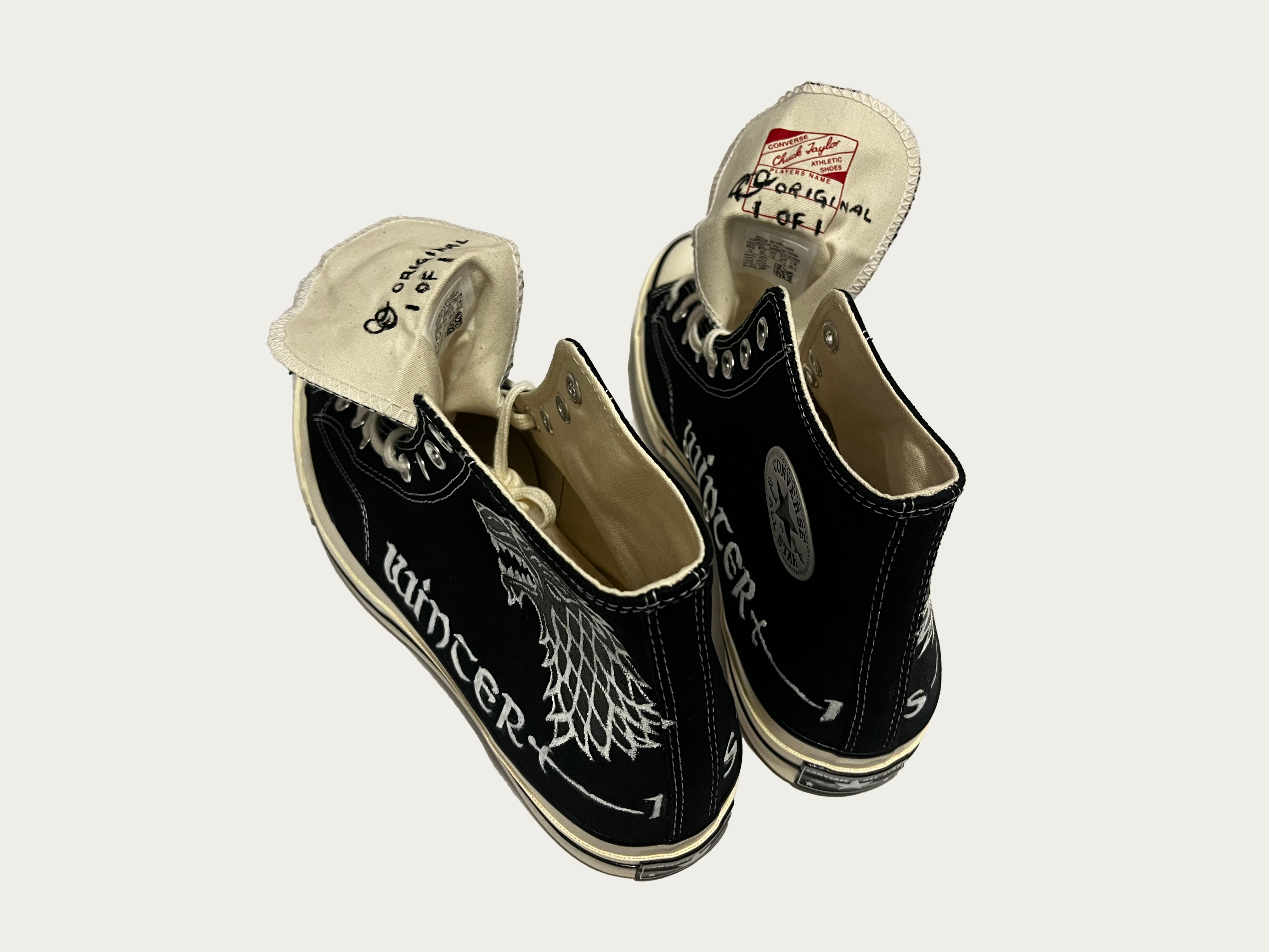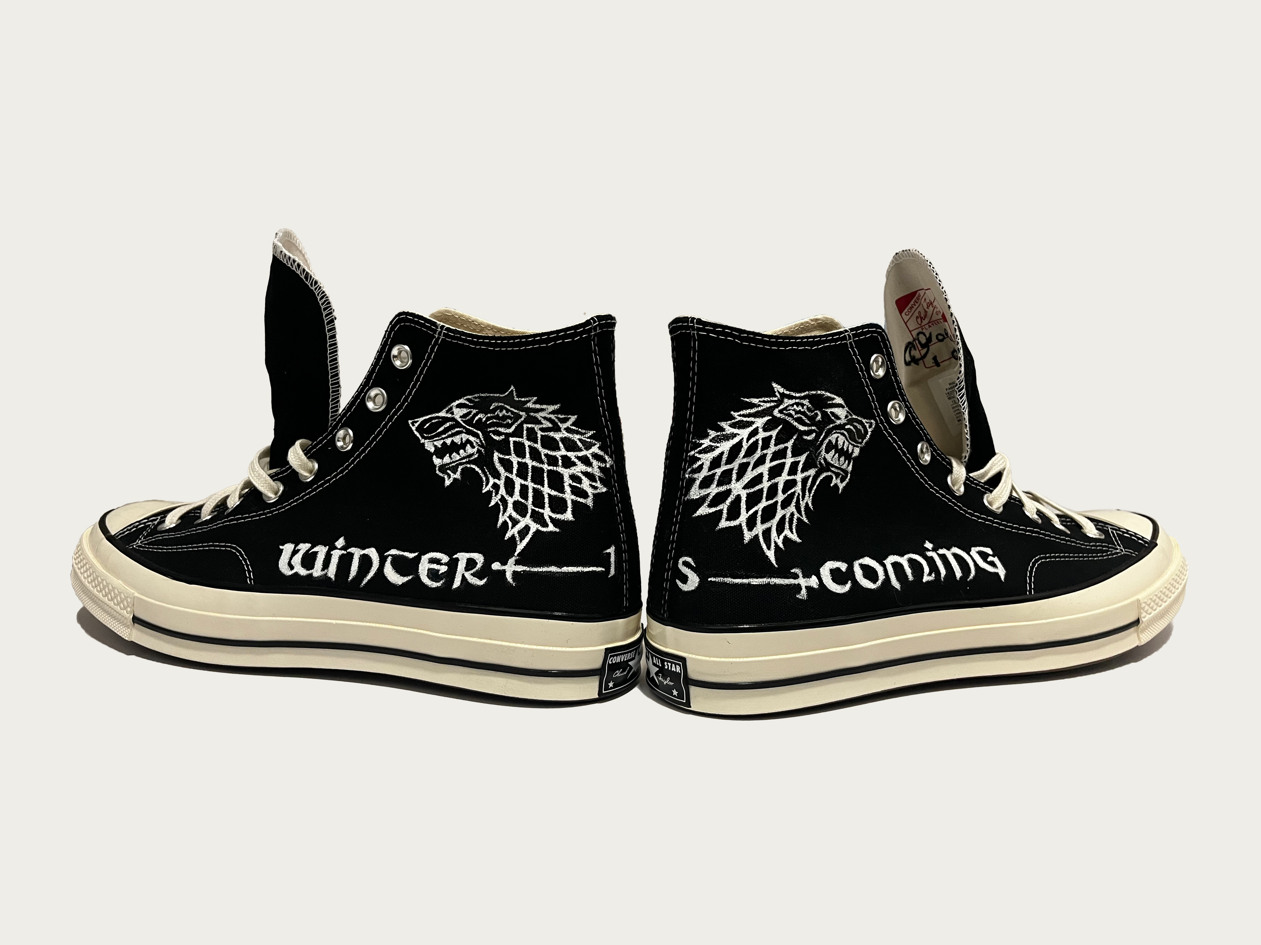 These Game of Thrones shoes were a commission pair. I started with a mockup so my client would be aware of the design they would be receiving. I discussed the process of how I would paint a water proof design onto their canvas shoes. They were ecstatic to have a new customized pair to add to their sneaker collection.