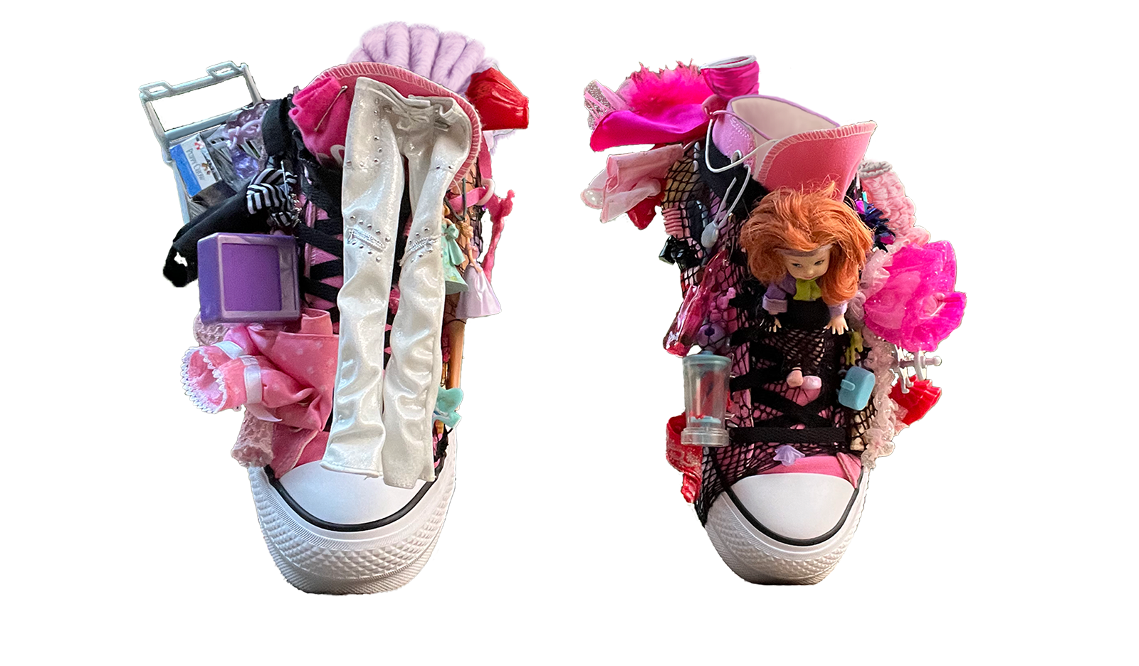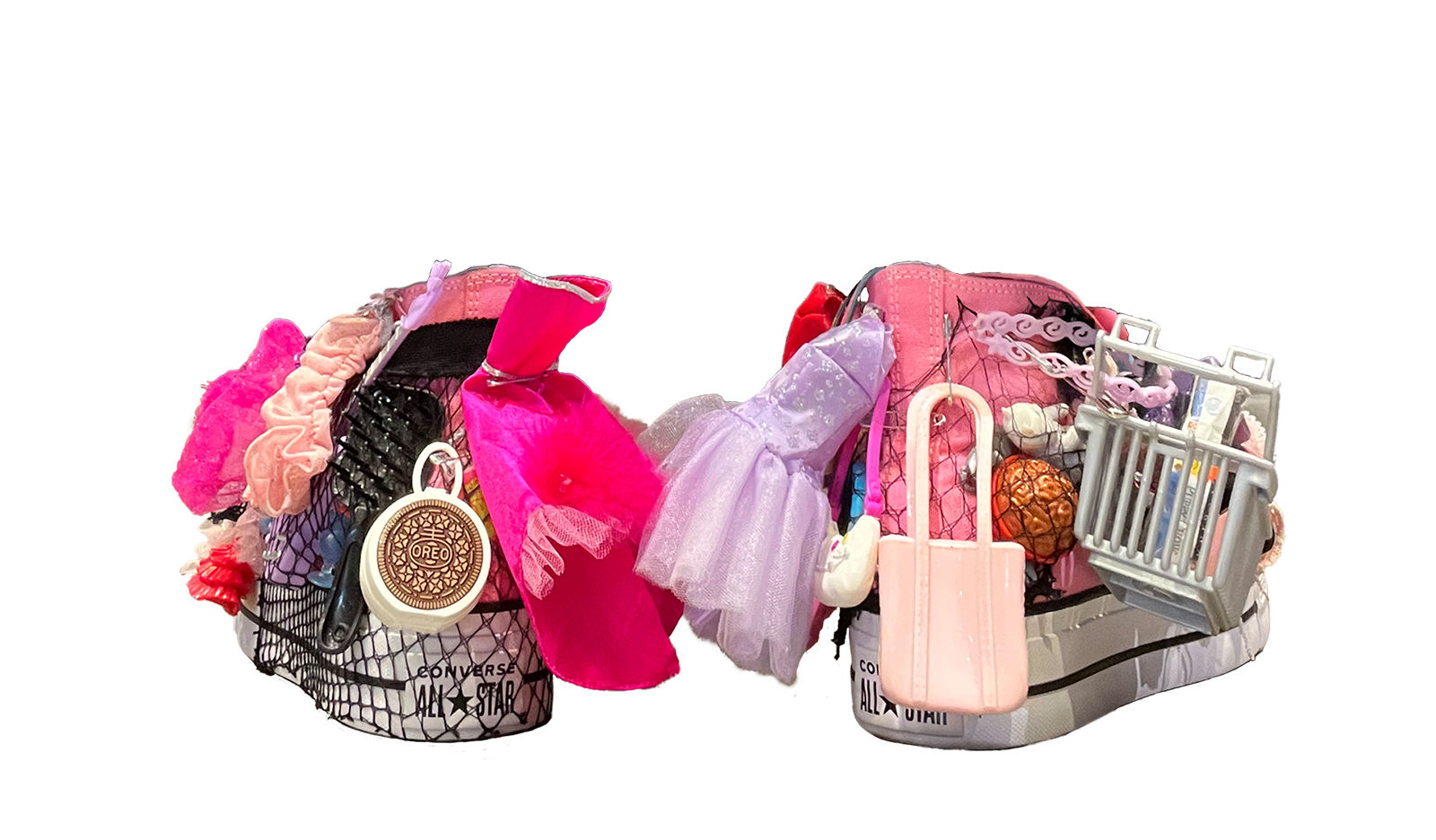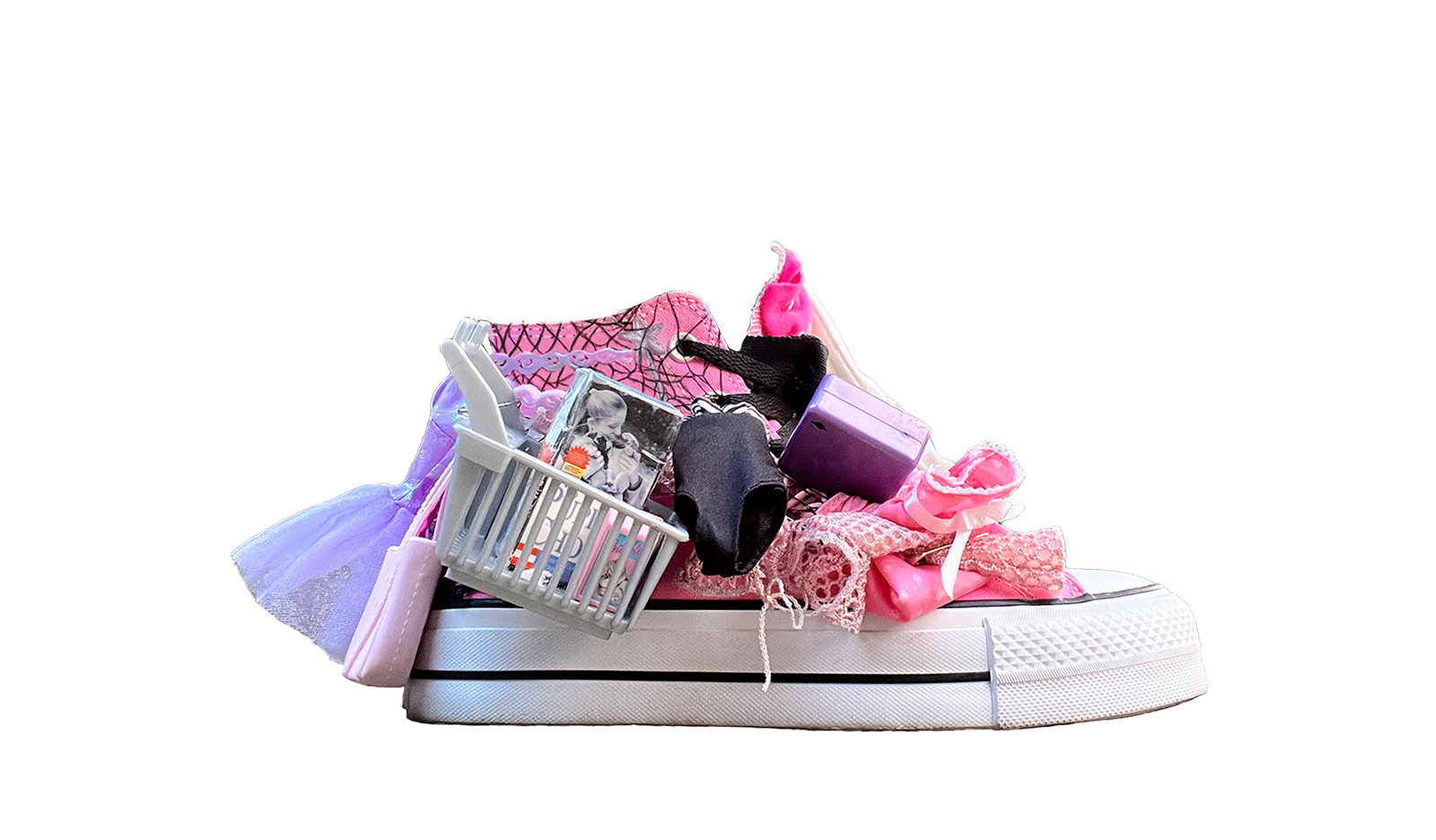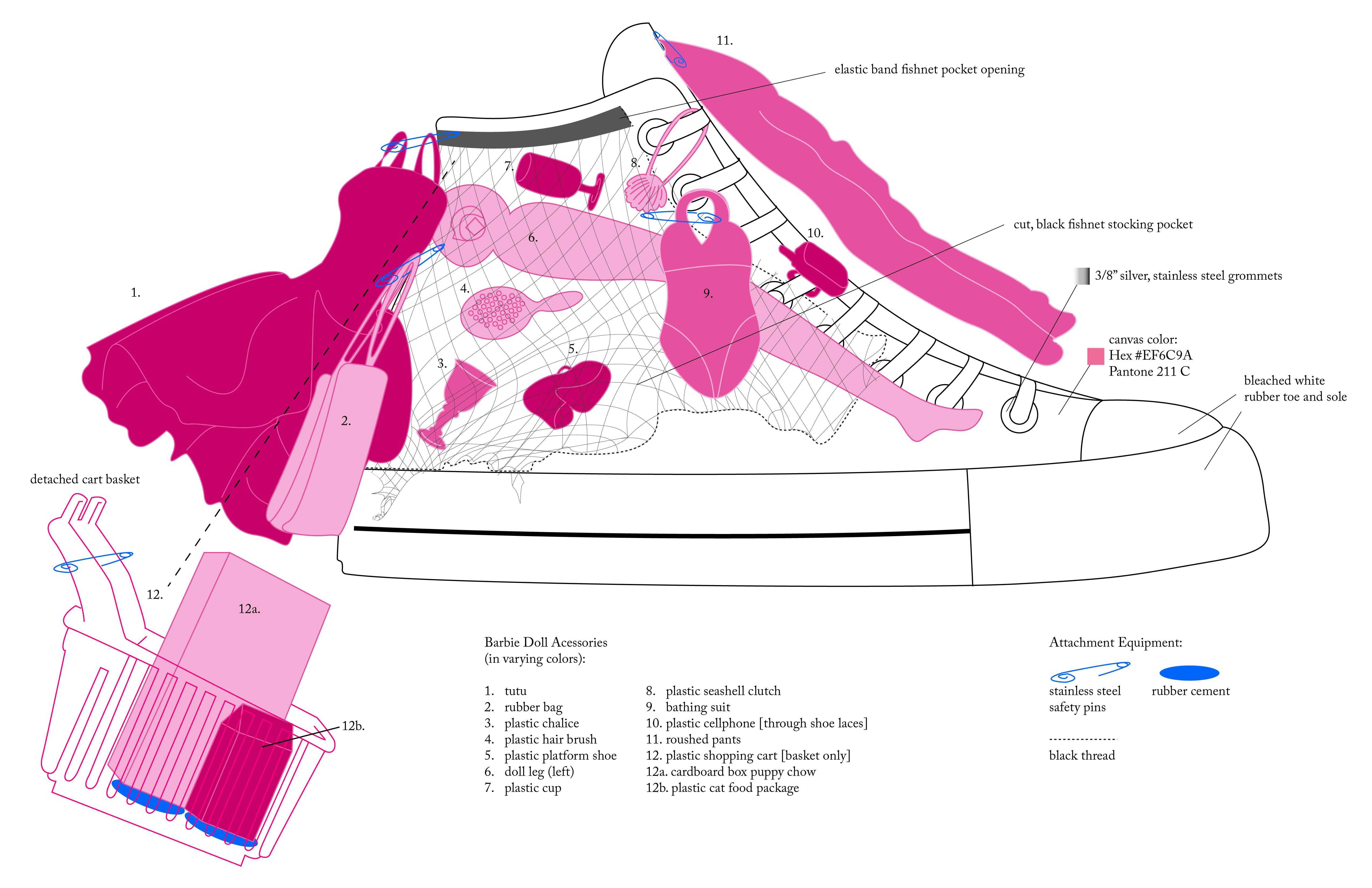 I started by sewing cut fishnets onto my shoes to create pockets for plastic accessories that couldn’t be fastened to the canvas. I then attached doll dresses and accessories with enclosed gaps above the fishnet pockets. Some of these pieces include purses with handles, a blender, a guitar amp, and a shopping cart. I also attached smaller pieces like Barbie bracelets, hair clips, and a cellphone to the shoe laces.