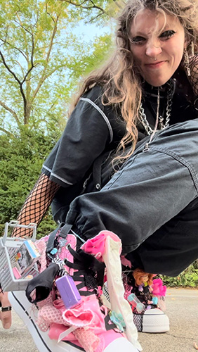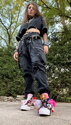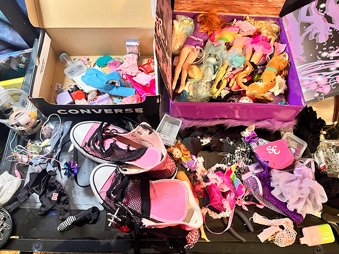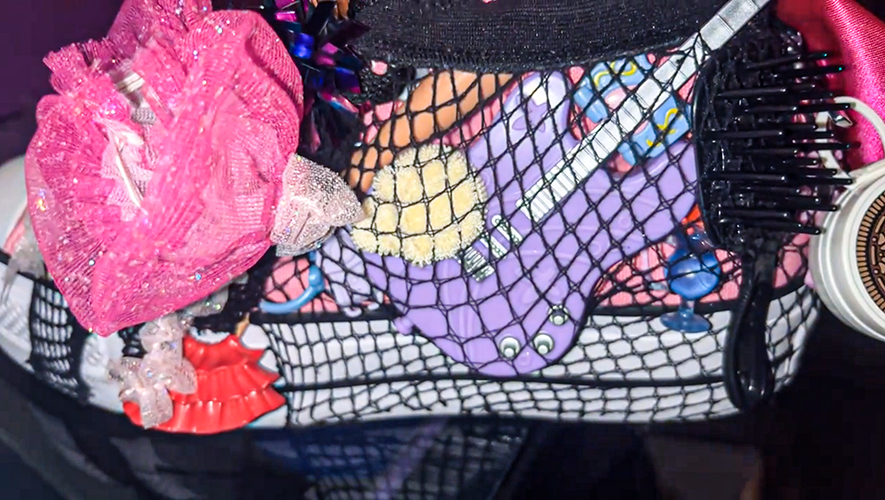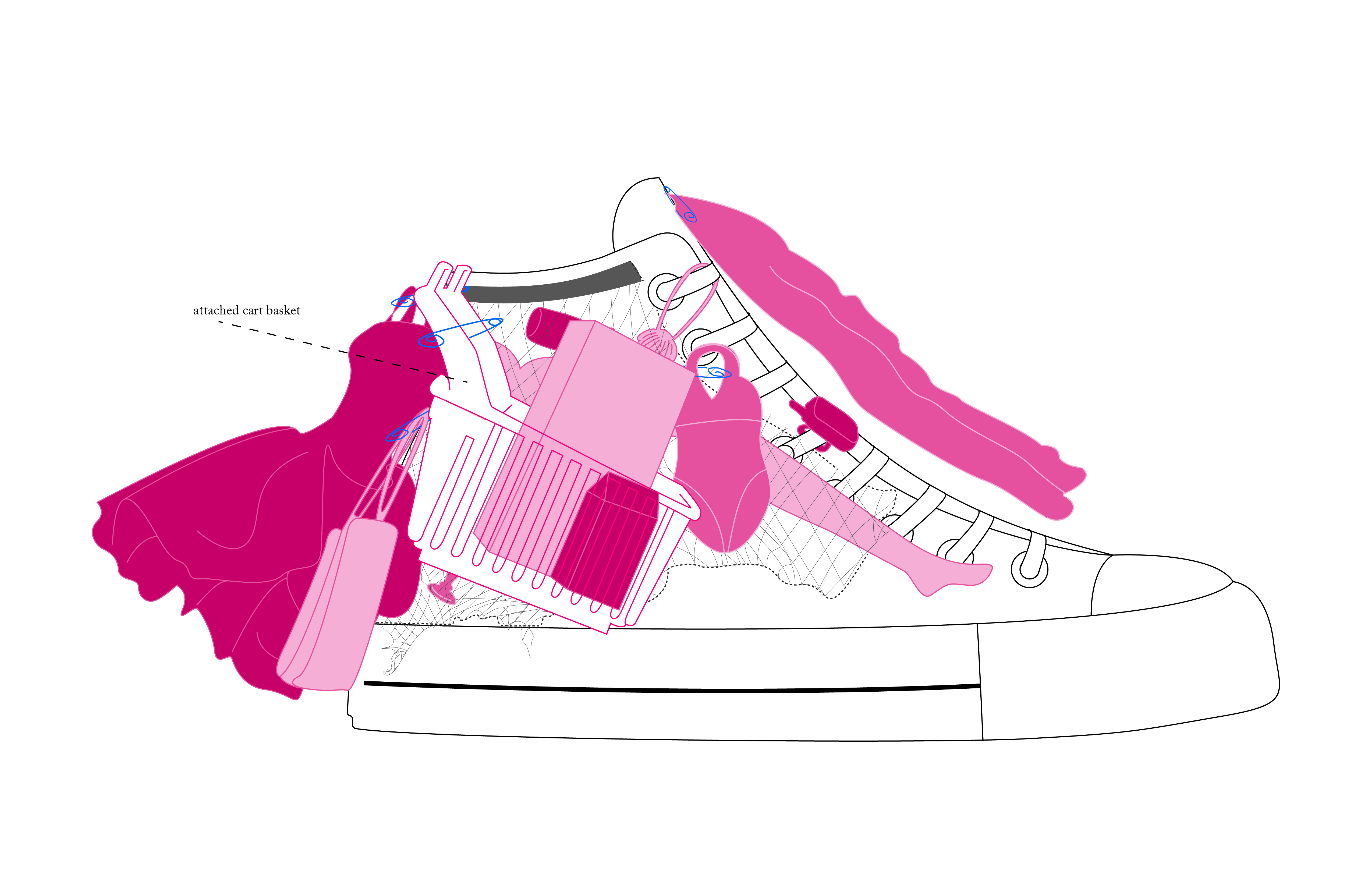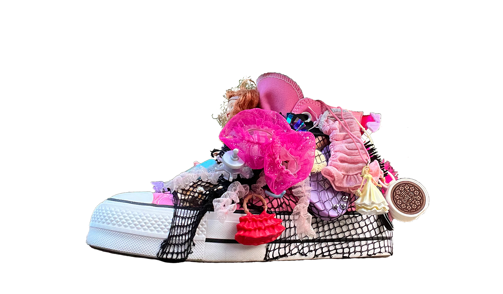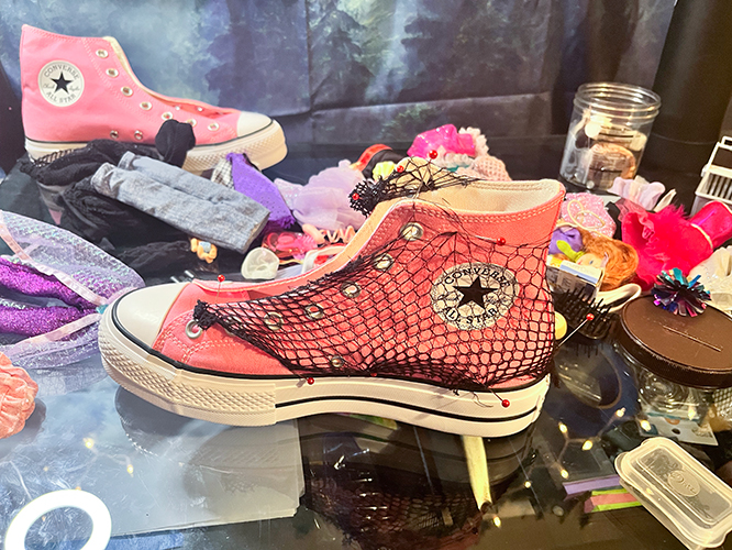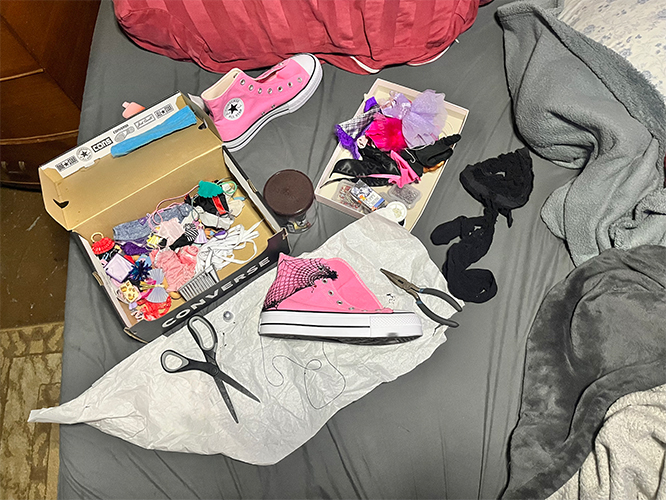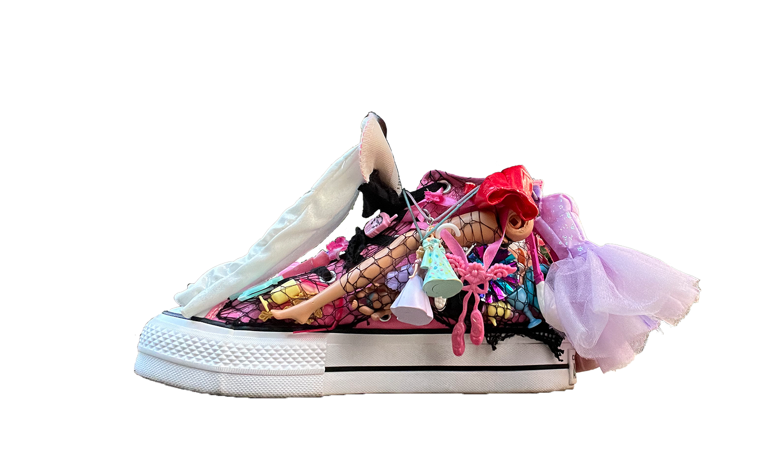 I started by sewing cut fishnets onto my shoes to create pockets for plastic accessories that couldn’t be fastened to the canvas. I then attached doll dresses and accessories with enclosed gaps above the fishnet pockets. Some of these pieces include purses with handles, a blender, a guitar amp, and a shopping cart. I also attached smaller pieces like Barbie bracelets, hair clips, and a cellphone to the shoe laces.