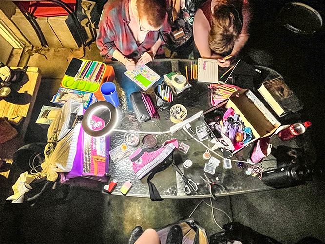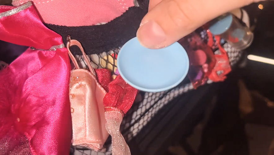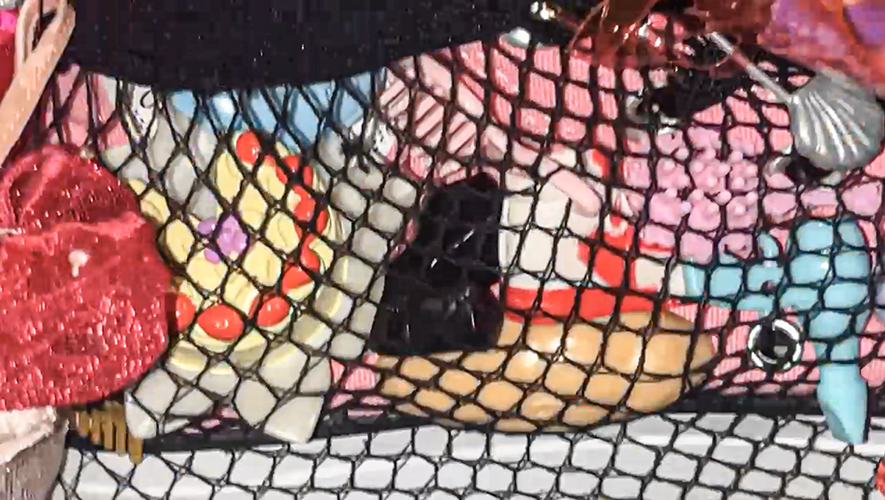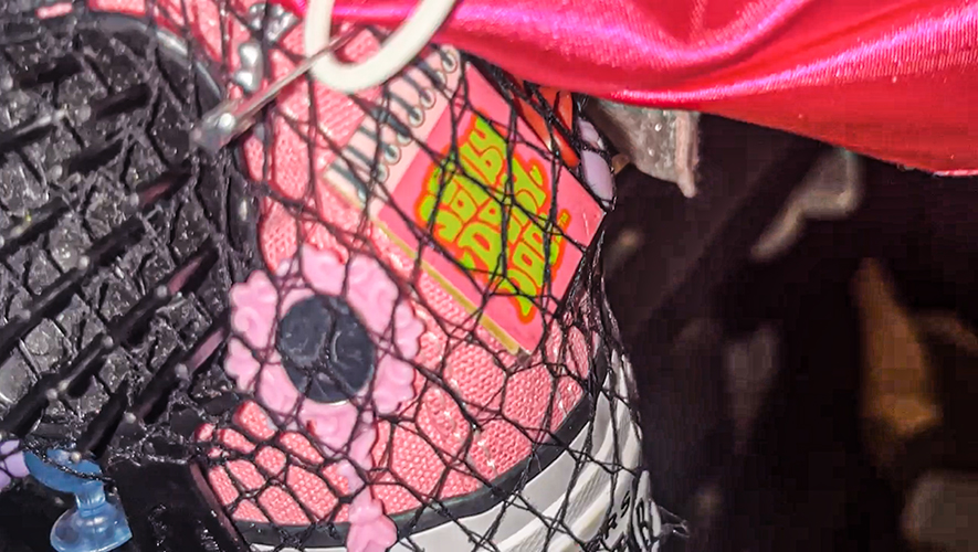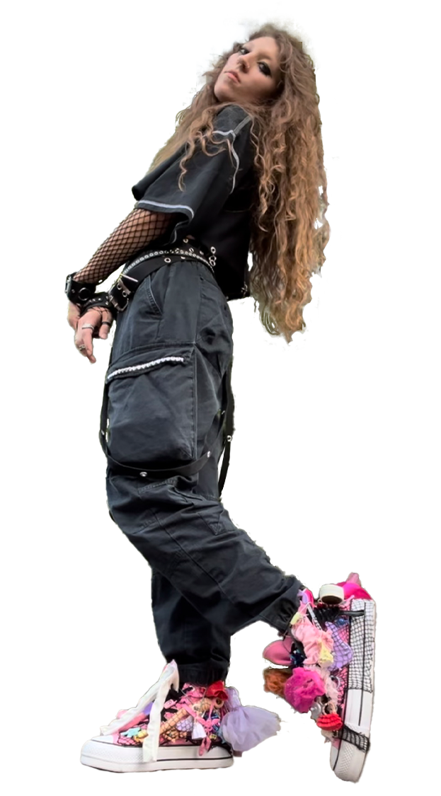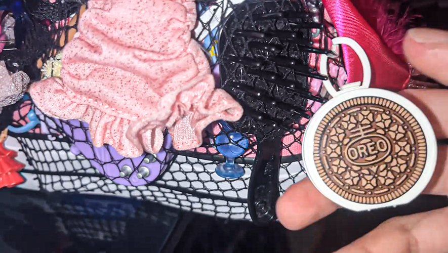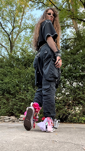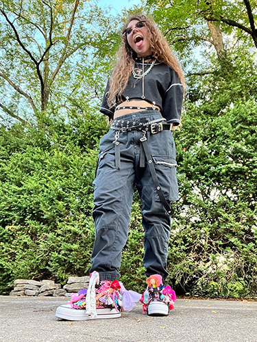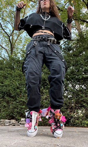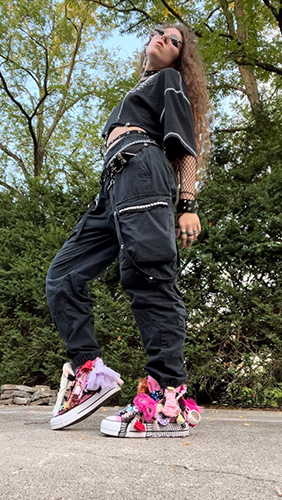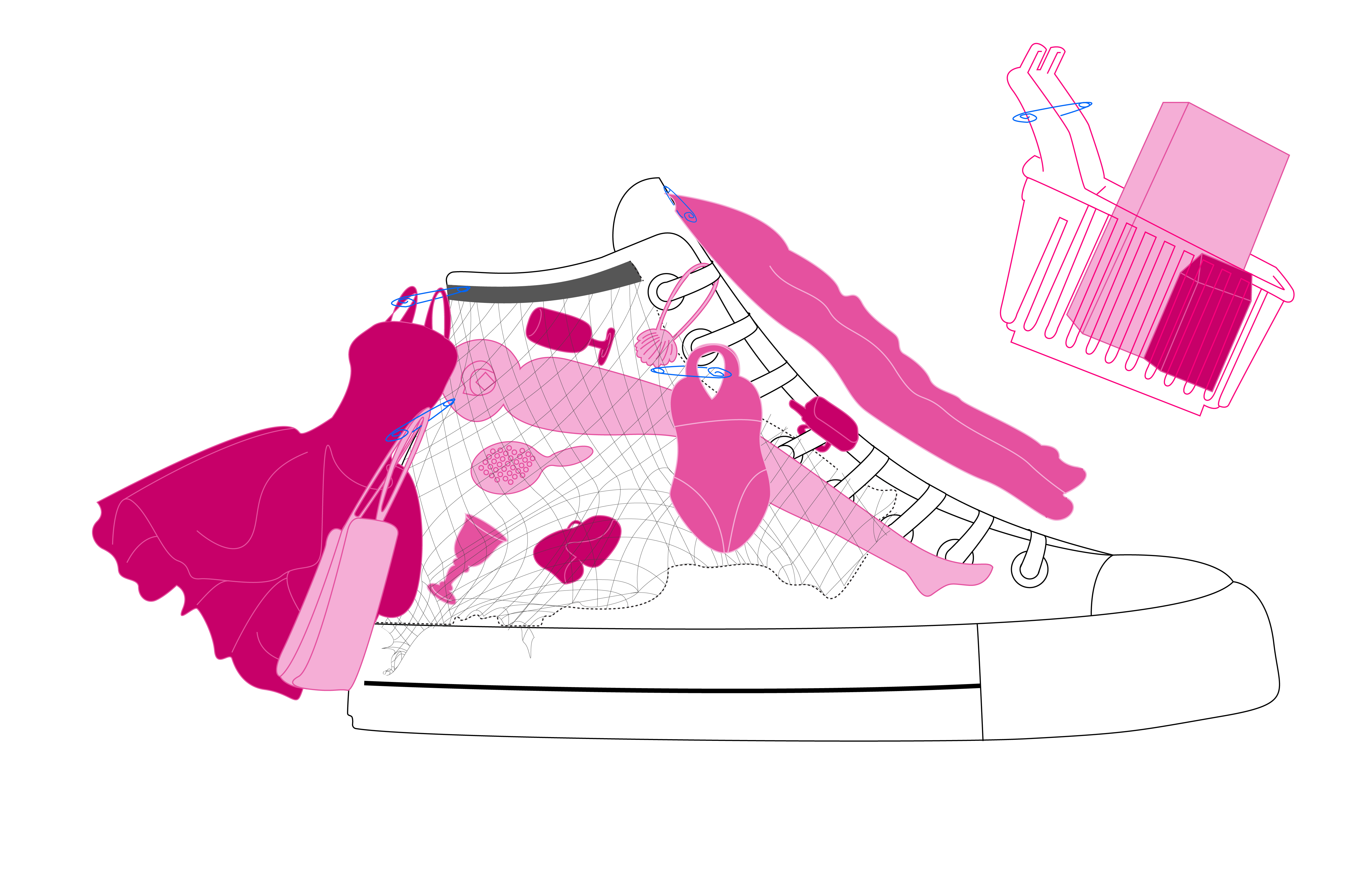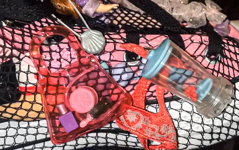 I started by sewing cut fishnets onto my shoes to create pockets for plastic accessories that couldn’t be fastened to the canvas. I then attached doll dresses and accessories with enclosed gaps above the fishnet pockets. Some of these pieces include purses with handles, a blender, a guitar amp, and a shopping cart. I also attached smaller pieces like Barbie bracelets, hair clips, and a cellphone to the shoe laces.