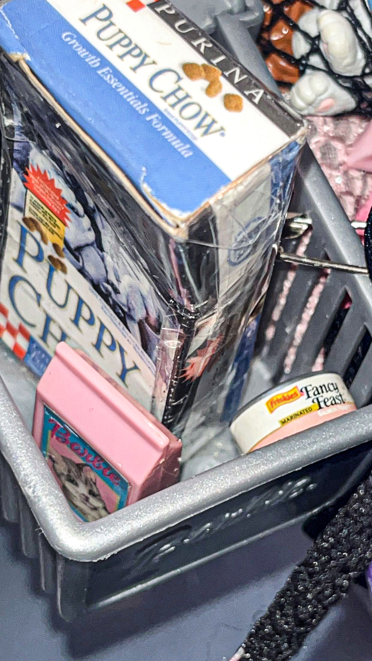 Safety pins was a crucial aspect for this shoe. In order to have true playtime, every piece must be removable. Using rubber cement, the shopping cart holds a cardboard box of dog food and two plastic cat food pieces after several walking user tests. All of these pieces, even if accidentally removed, can be reattached to the shoes.
