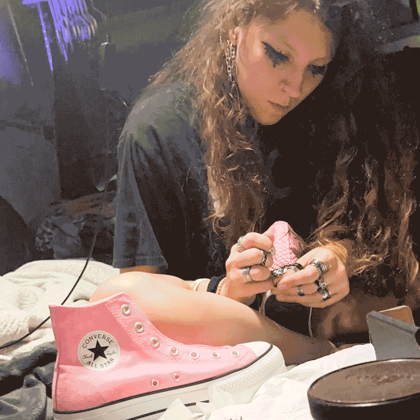 After editing the photos from my self-directed photoshoot, I used the image assets to create a mock Converse ad. I created my ad to mimic their SMS (text) ad branding to demonstrate my visual marketing skills. My goal is to achieve a playful, eccentric mood to draw intrigue to the SMS recipient through eye-catching movement, color change, and contrasting sketches.
