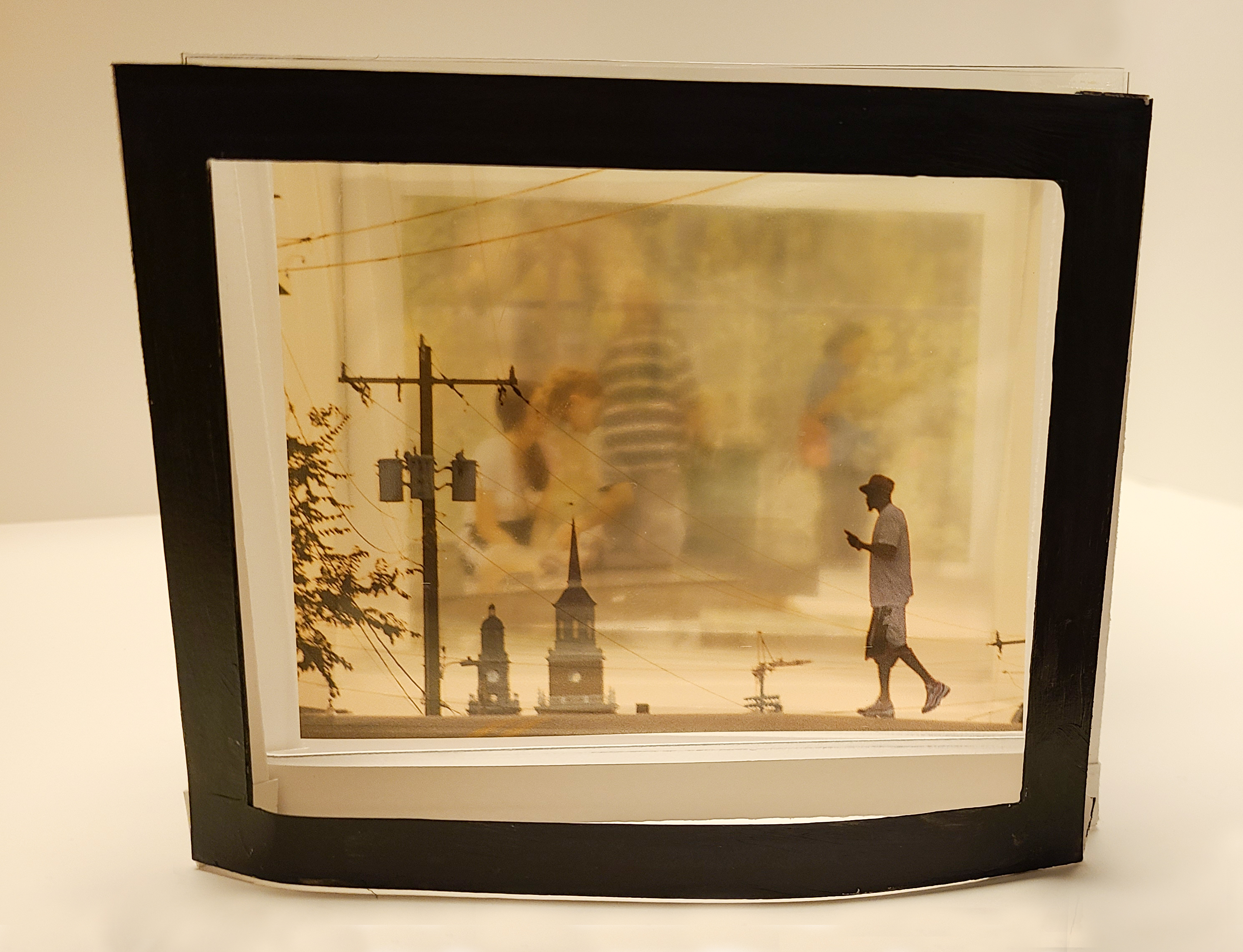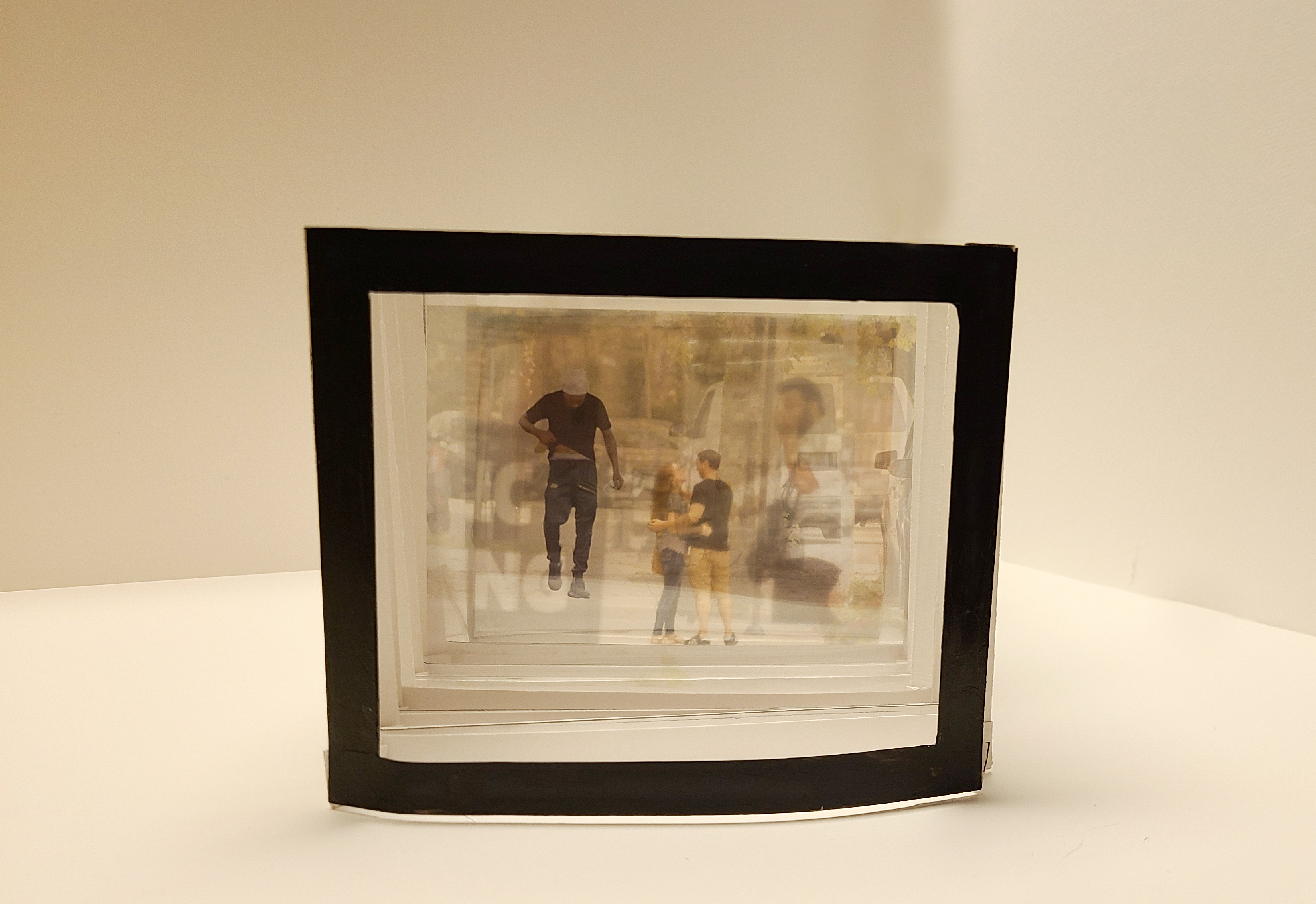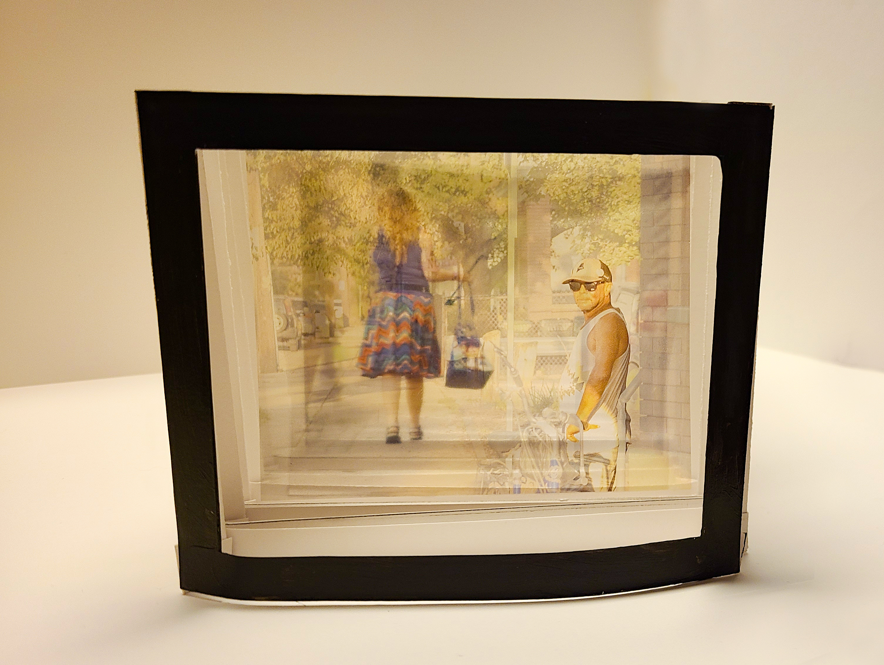 When all photos are positioned within the framework, the image becomes difficult to see through as all the transparencies impair the images’ visual clarity. Taking out photos clarify more of the photographic details. This concept demonstrates the feeling of hyper-awareness leading to overstimulation. When overstimulated, I cannot focus clearly, just as the viewer may struggle to see clearly when viewing multiple transparent images at one time.