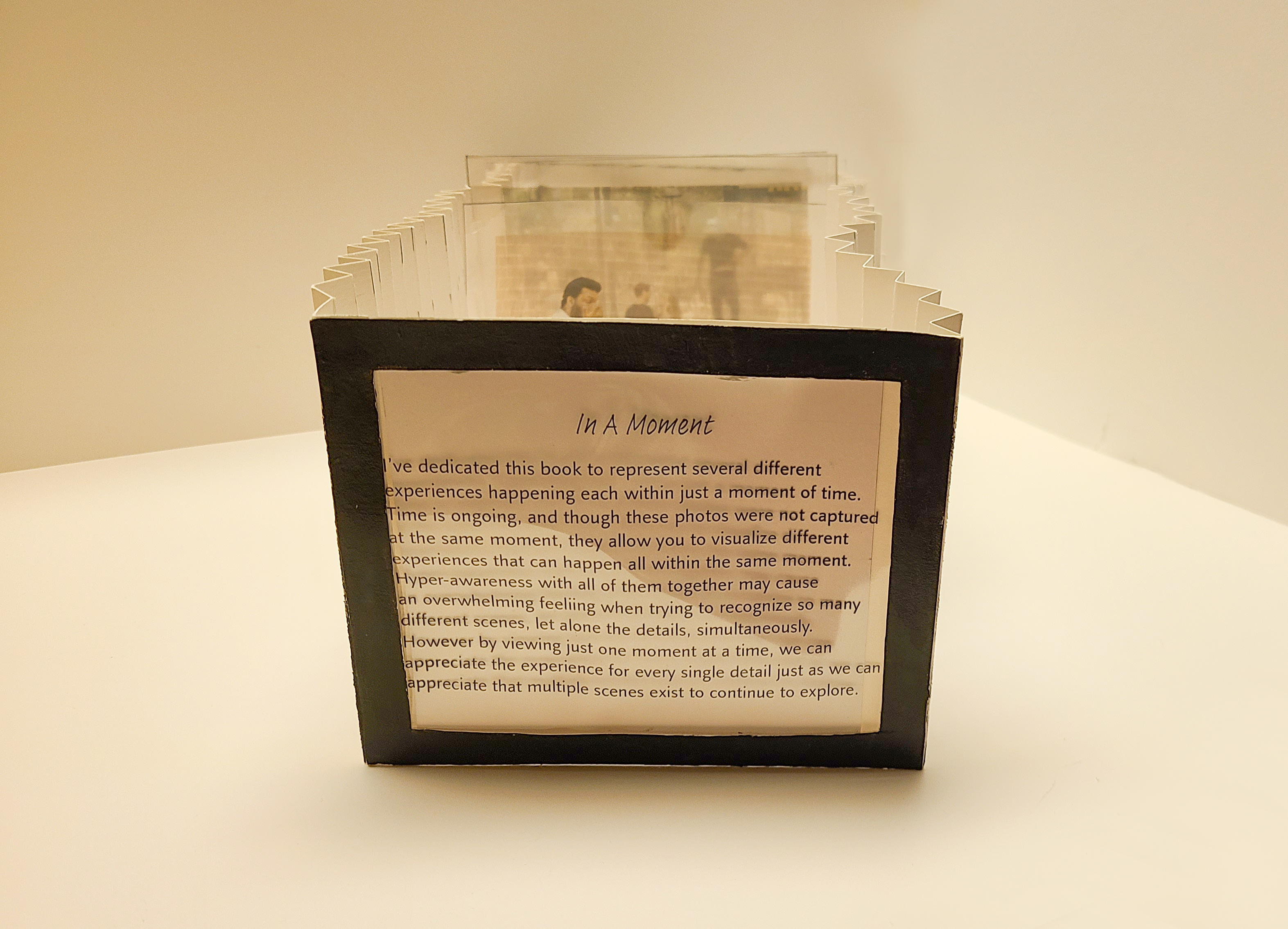 I created an unconventional photobook that would allow the viewer to see multiple people moments happening simultaneously. While I was taking photos, I became hyper-aware of the people around me. I noticed within myself that hyperfixating on the multiple people at one time then overwhelms me. This moment I had inspired me to replicate this feeling of hyperfixation and hyperawareness. I replicated this feeling of hyperfixation using my photo tunnel book.