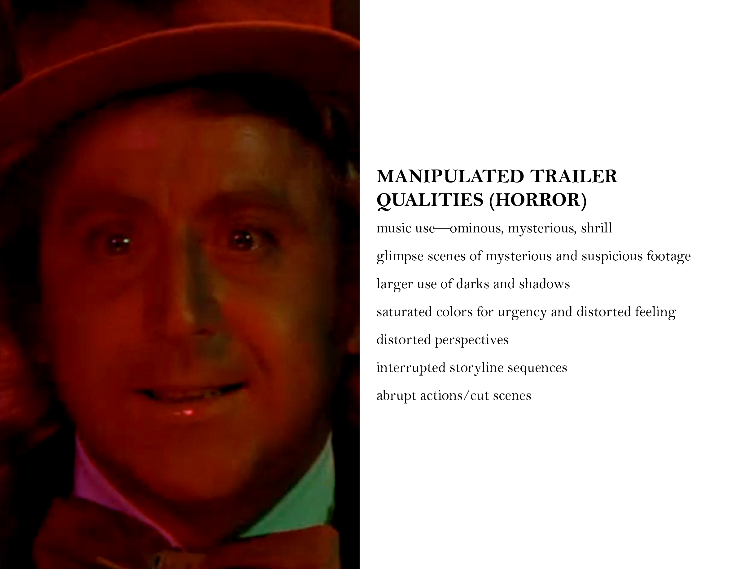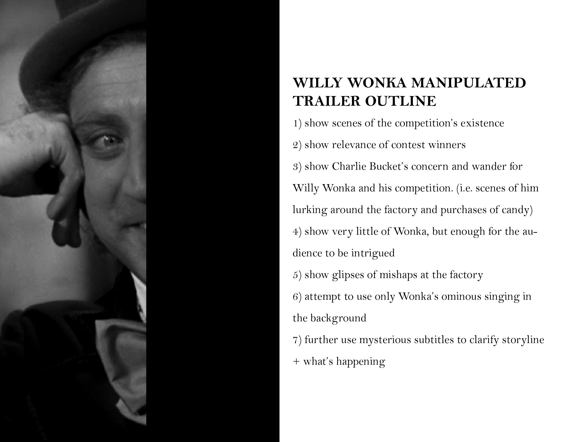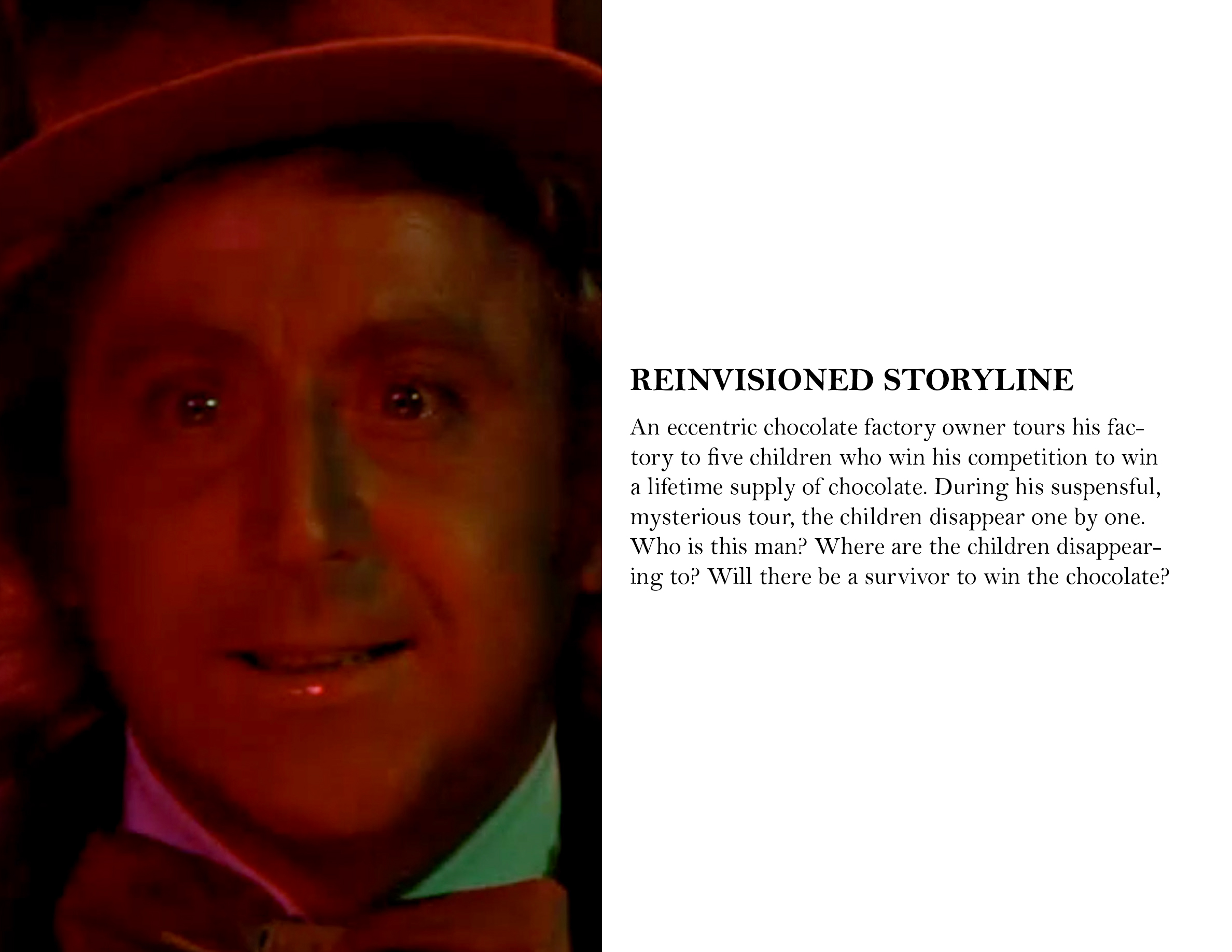 The Reimagined Willy Wonka concept trailer is a college project meant to change the original narrative of a pre-existing film. The original Willy Wonka and the Chocolate Factory is a beloved family film that creates room for mystery and bewilderment. I decided this would be the perfect film to emulate a horror/thriller genre. Pairing edited audio clips with footage, I portray Willy Wonka as the untrustworthy protagonist. This project taught me how to create a film trailer in addition to audio editing using Adobe Audition and video clip editing using Adobe Premiere Pro.