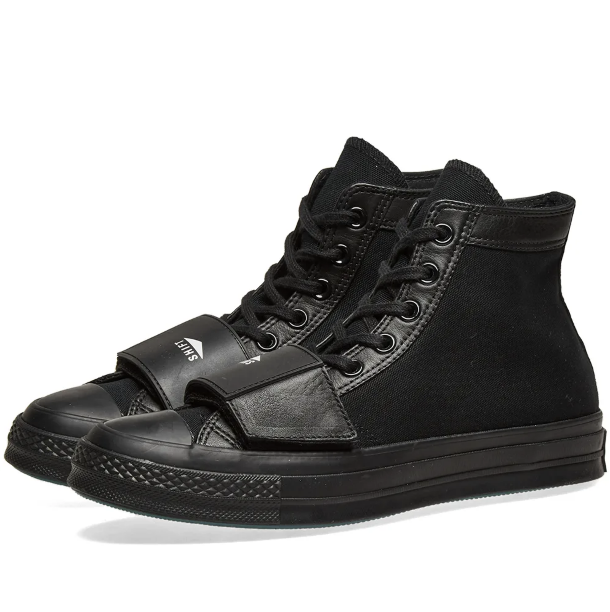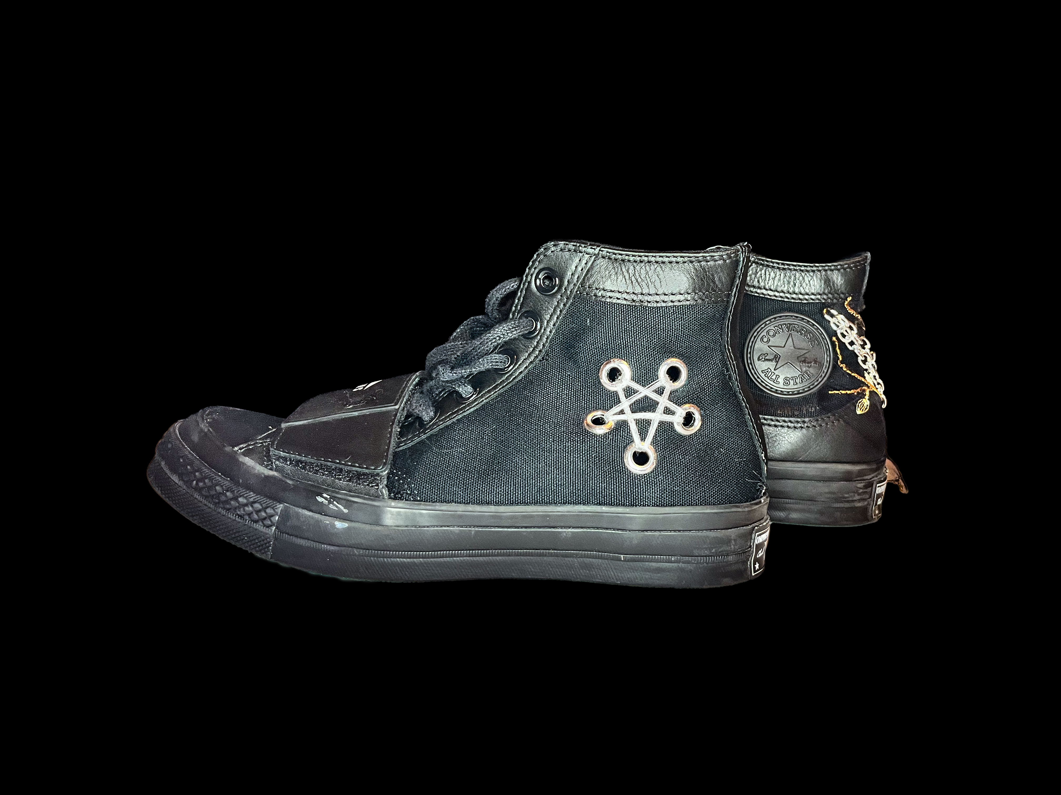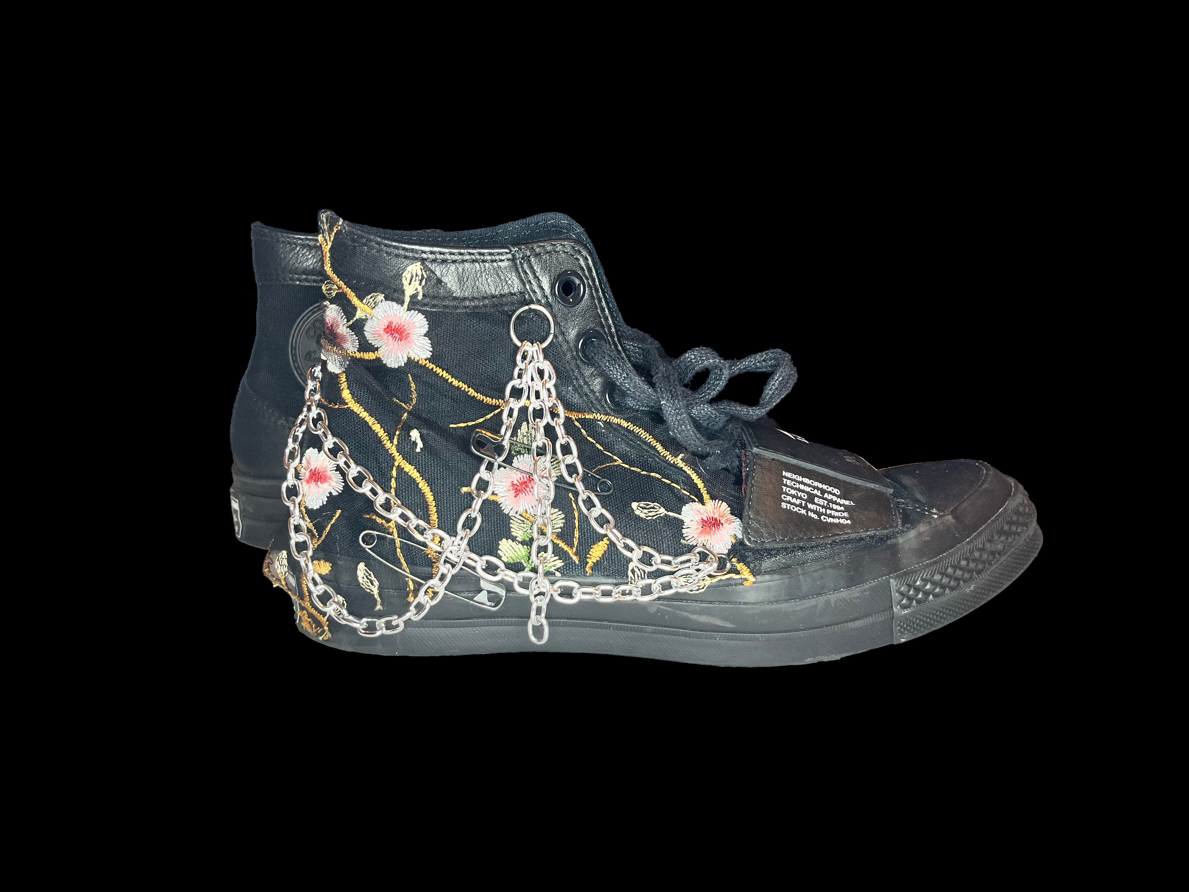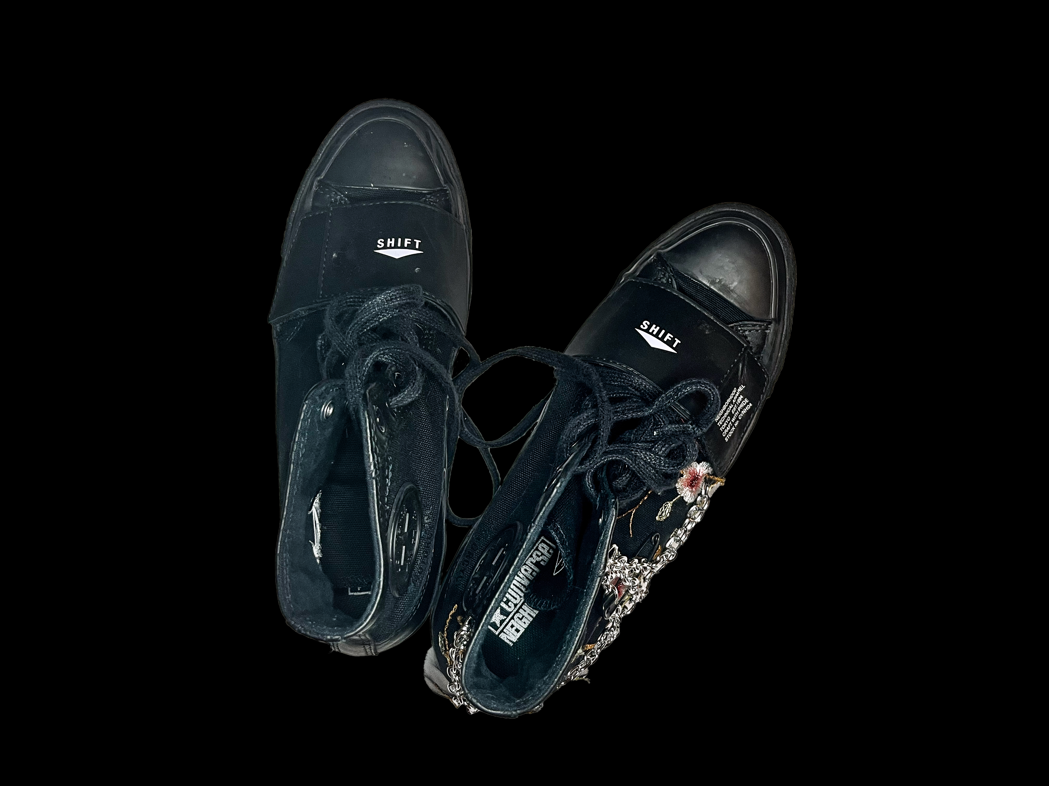 Whenever I feel like I need a new clothing piece or shoe, I tend to craft a new design from within my existing wardrobe. Using these Converse x NBHD shoes as a base, I attached grommets, scrap lace, chains, and safety pins to create a punk aesthetic.