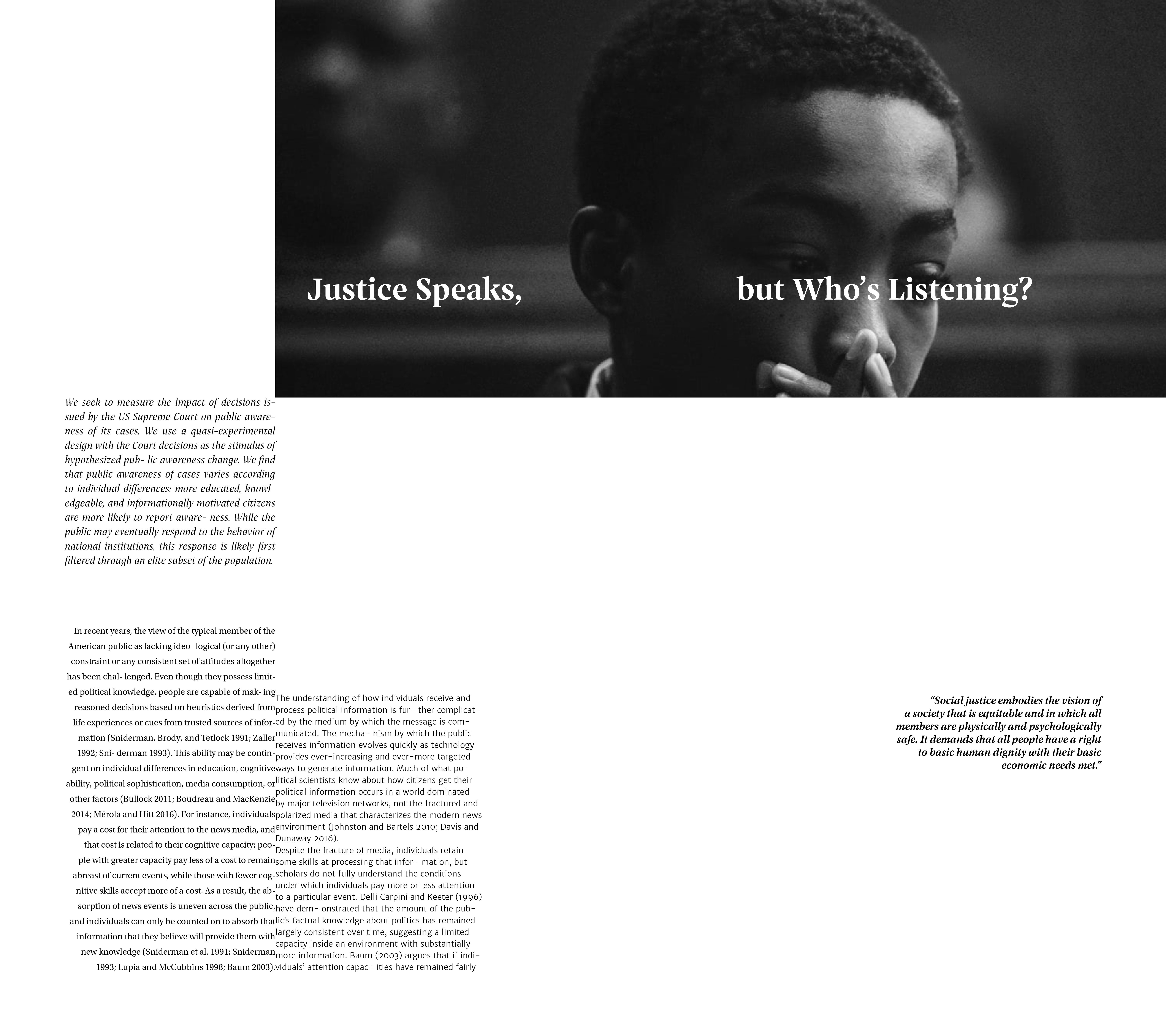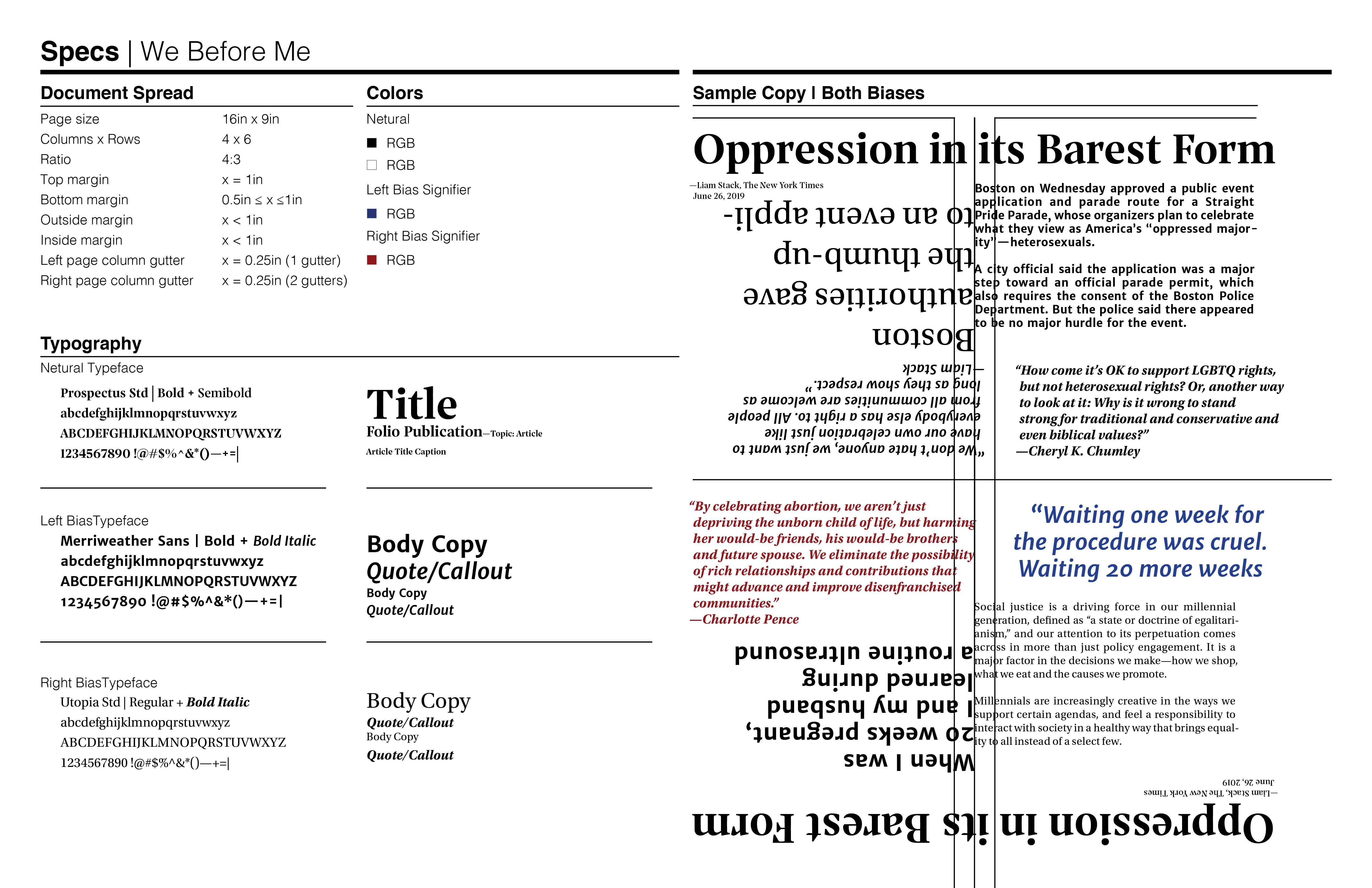As it was a college project, my deliverables included creating a title and layout samples for this fictional publication. I created typesetting rules for the layouts to the publication to create a sense of cohesion between the theoretical sections within this publication. This publication uses text facing both right-side-up and upside down to provide two sides of a story topic, emblematic of how each story has more than one perspective. The wordmark works in this same way that either way it is turned, the reader can recognize and read the title the same way, despite it being upside down or right-side-up.